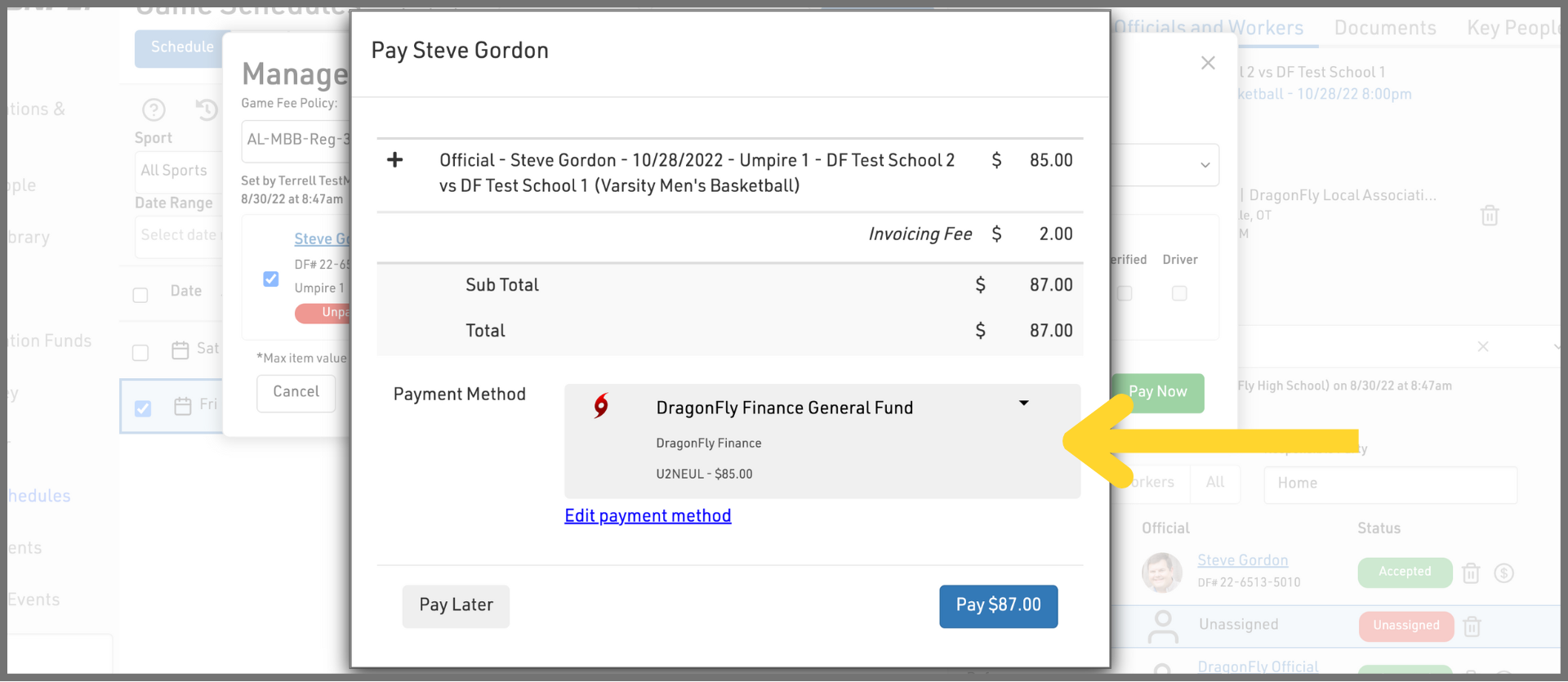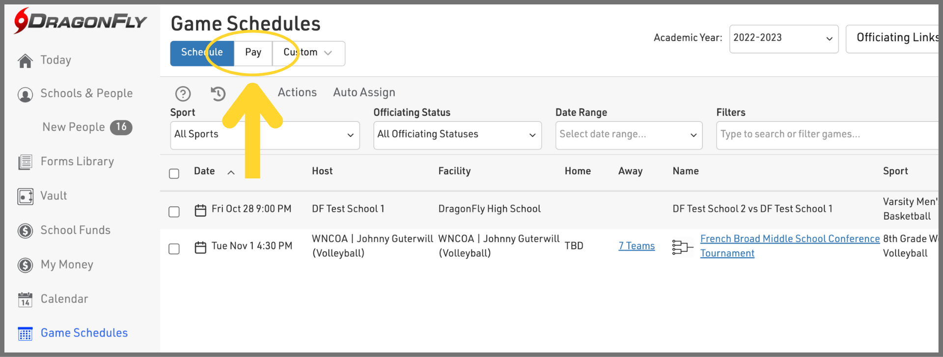 Schools and associations: once you set up and fund your DragonFly Cash Account, you can pay officials and game workers in the Game Schedule.