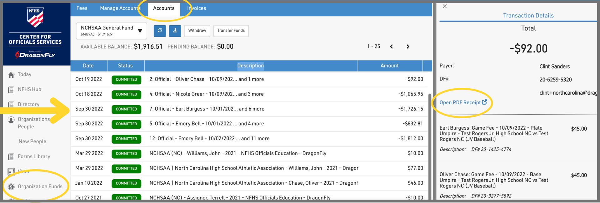 Note: You'll need to set up and fund your DragonFly Cash Account before you can pay officials. Click here for instructions on completing this preliminary step.