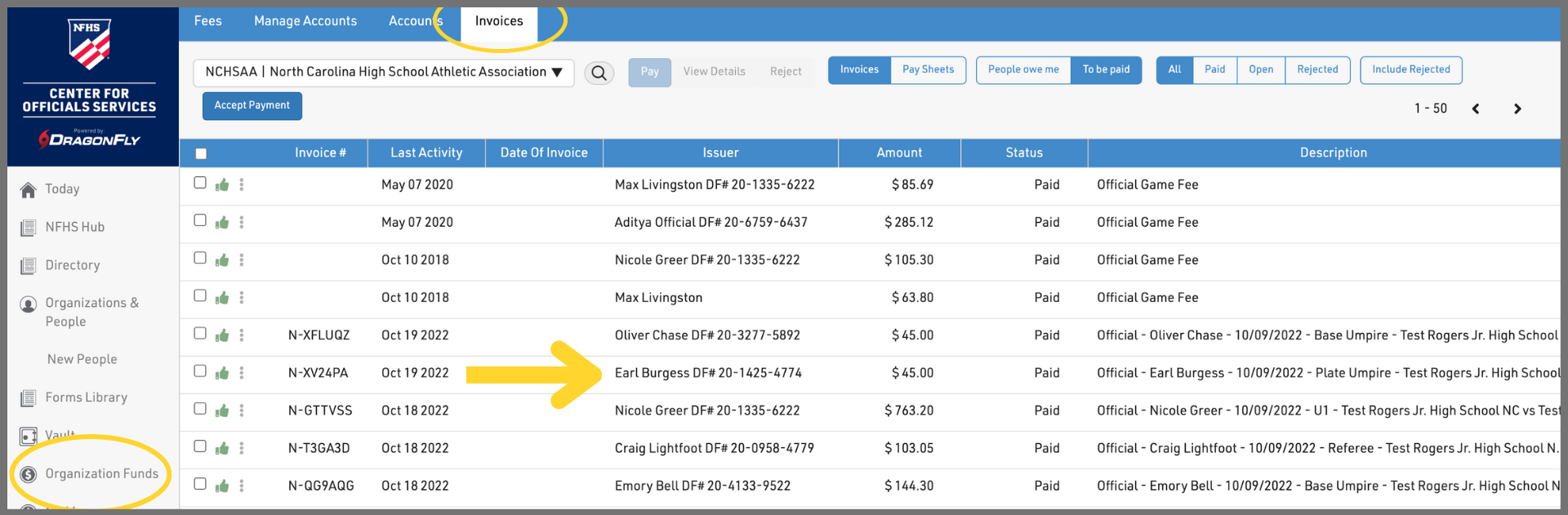 10. If in addition to a receipt you need an invoice for the transaction, select 'Organization Funds' then 'Invoices' and find the transaction in the list with the official or game worker's name.