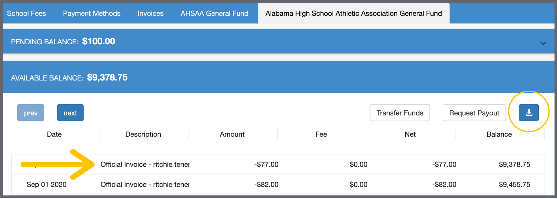 10. Once a payment has been sent, you will see the individual transaction in the cash account that you used as your payment method. You can export the transaction to a spreadsheet by selecting the download button in the top-right corner.