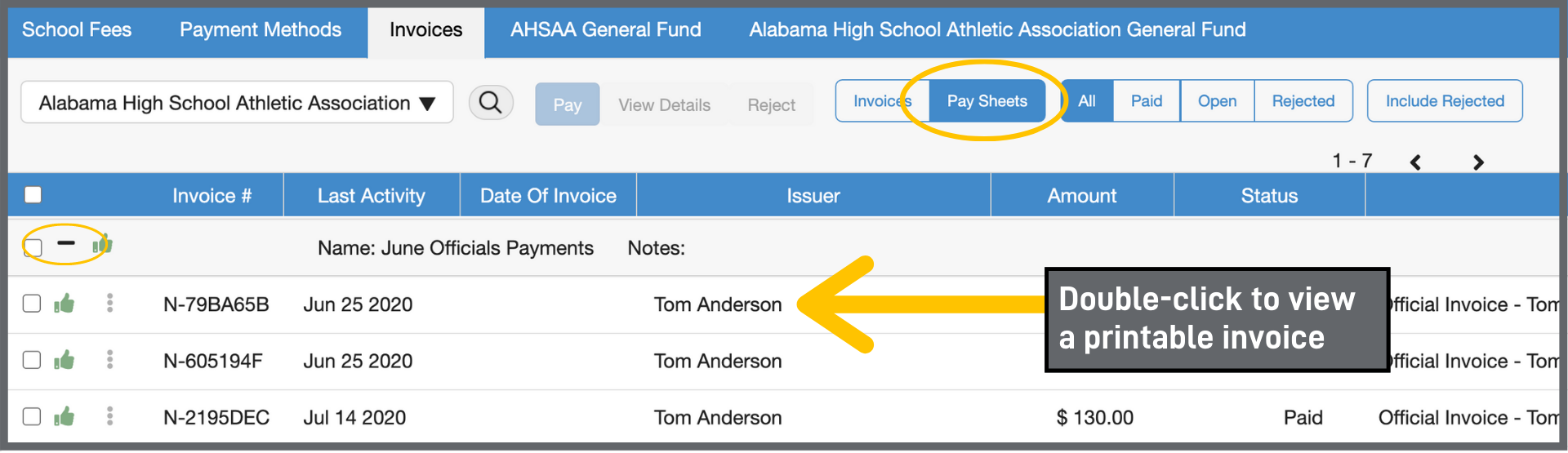If you paid by pay sheet, select the 'Pay Sheets' tab at the top of the screen, then click on the '+' icon in the line item for a list of all invoices paid. You can double-click on an item to view a printable invoice in an overlay window.
