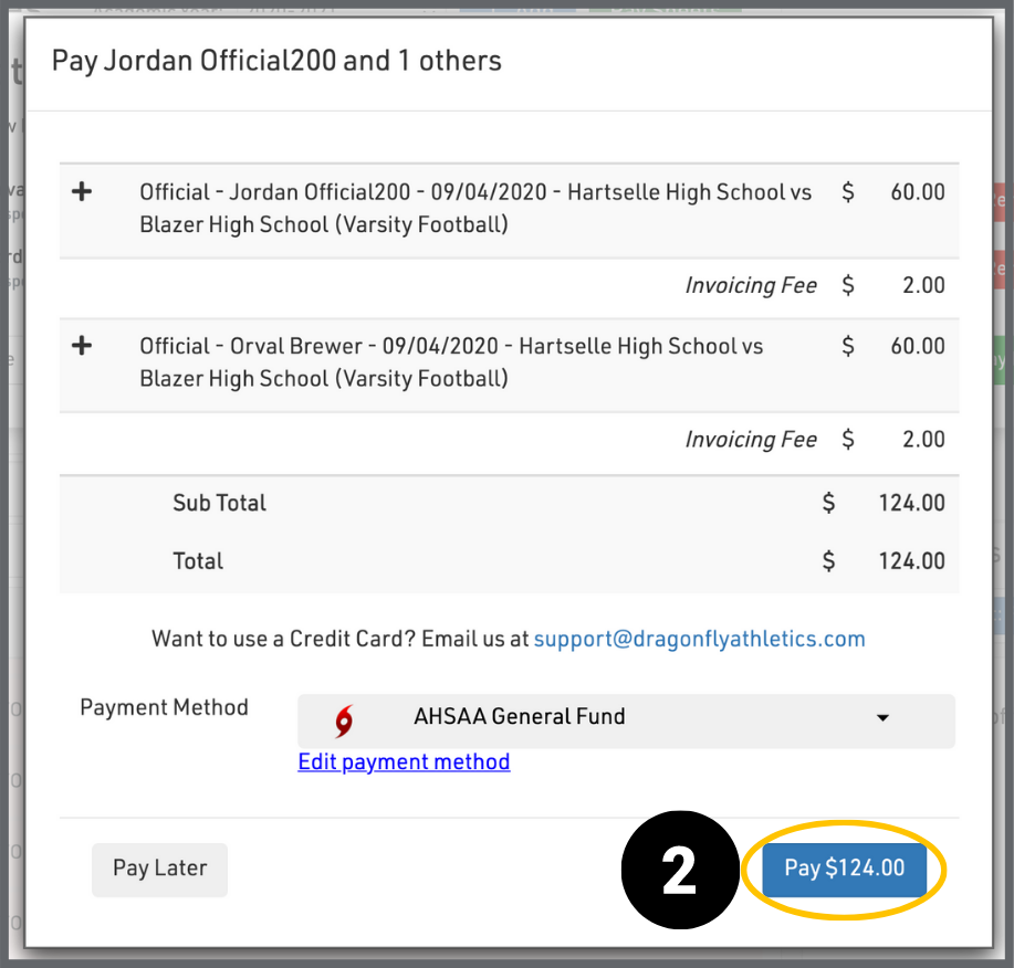 Note: You'll need to set up and fund your DragonFly Cash Account before you can pay officials. Click here for instructions on completing this preliminary step.