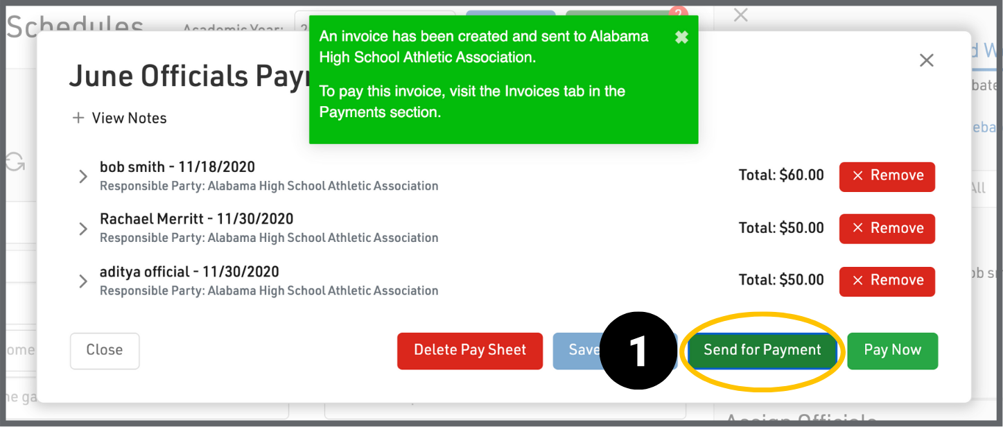 9. Select 'Send for Payment' to generate an invoice for your organization, which you can view by visiting 'School Funds/Organization Funds' > 'Invoices' > 'Pay Sheets'.