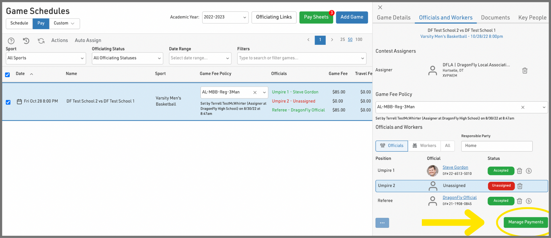 4. Select the 'Manage Payments' button under the list of officials or game workers.