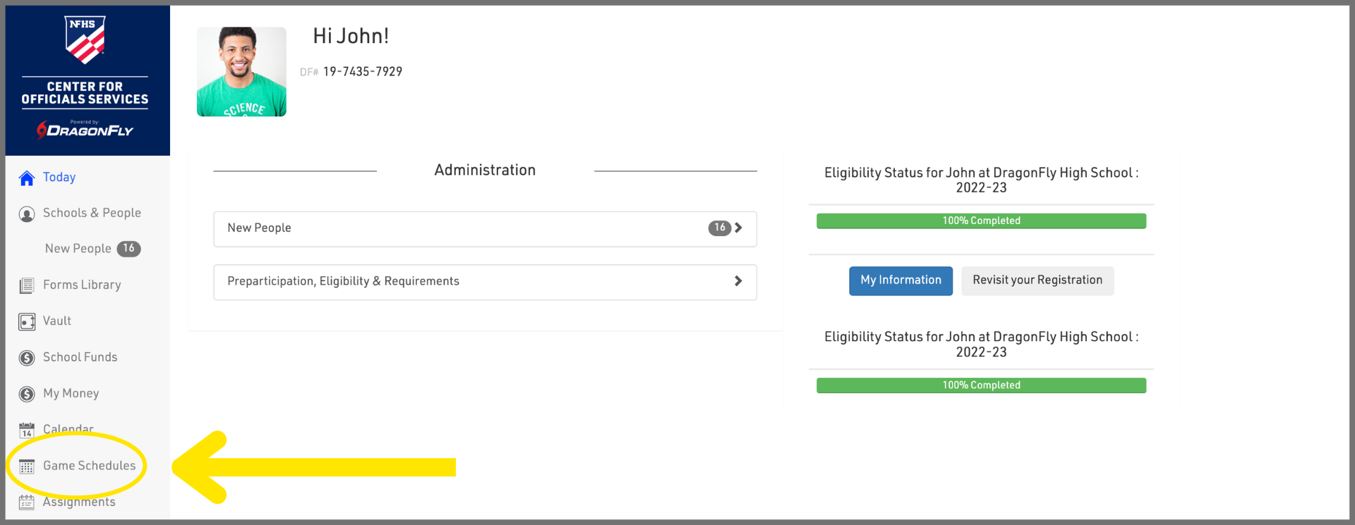1. Log in to DragonFly on your computer's web browser and select 'Game Schedules' in the left-side menu.