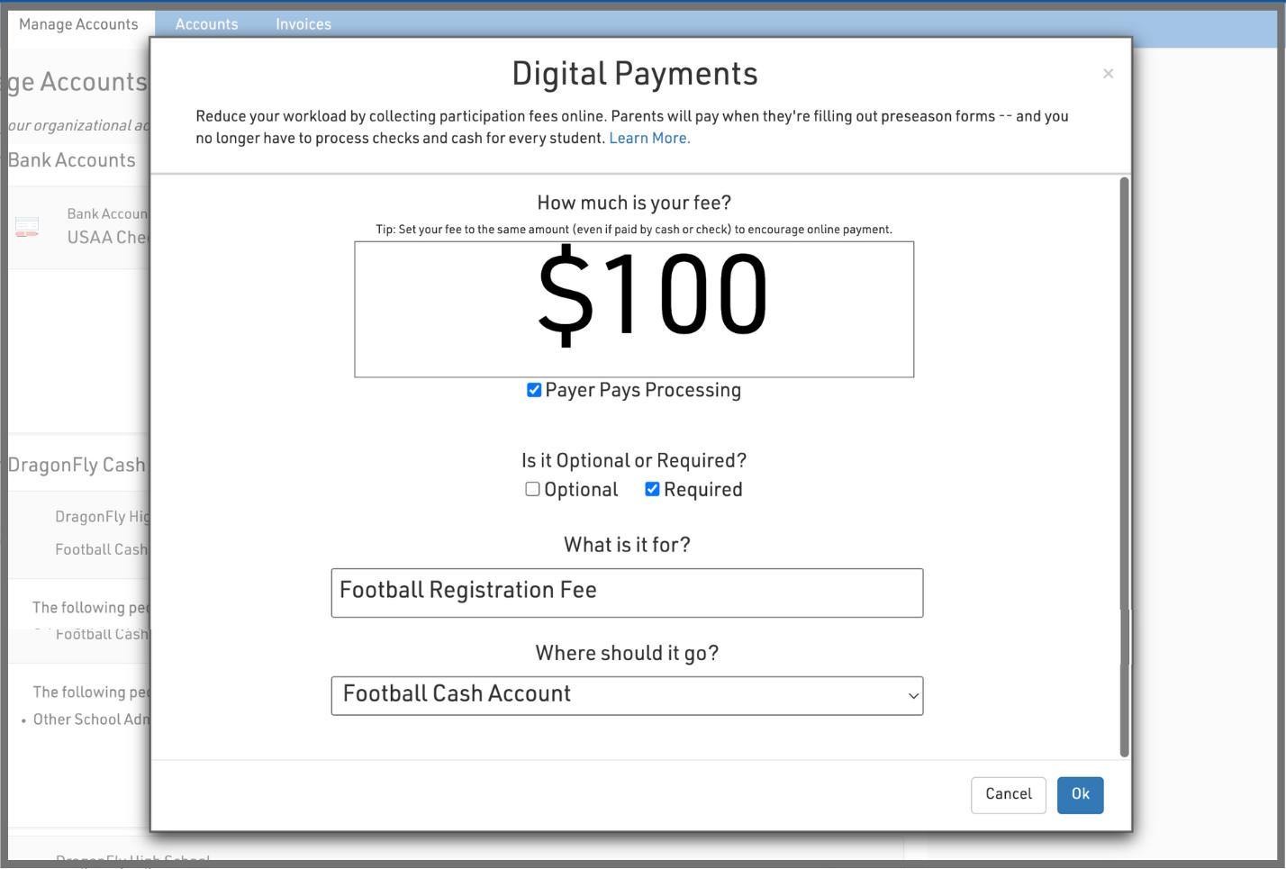 It's quick and easy to collect a participation fee in DragonFly. Parents will pay when they're filling out paperwork and you no longer have to process checks and cash for every student in your program.