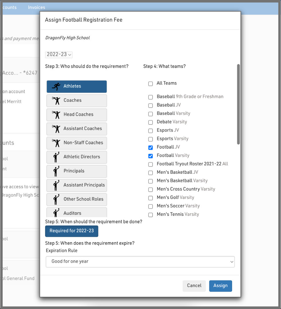 4. Assign the fee to a specific group, team, and school year from the visible options. Also give the fee an expiration date. When completed, select the 'Assign' button.