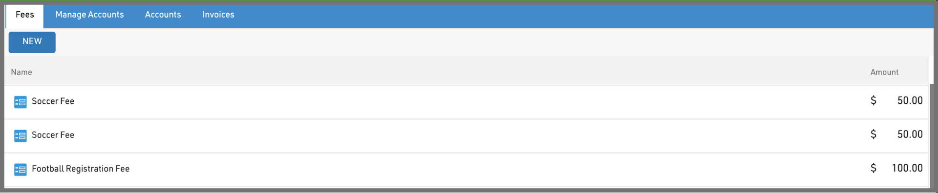 2. Select the 'NEW' button in the top-left corner. If your school has any existing fees, you will see them in a list.