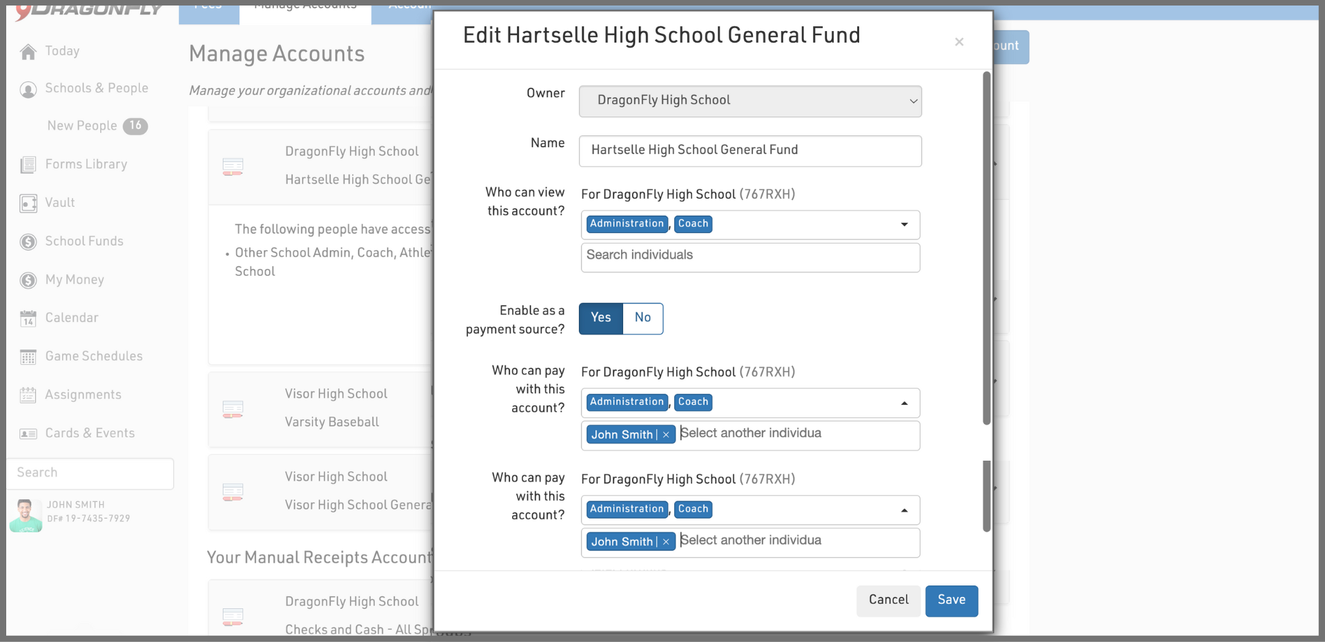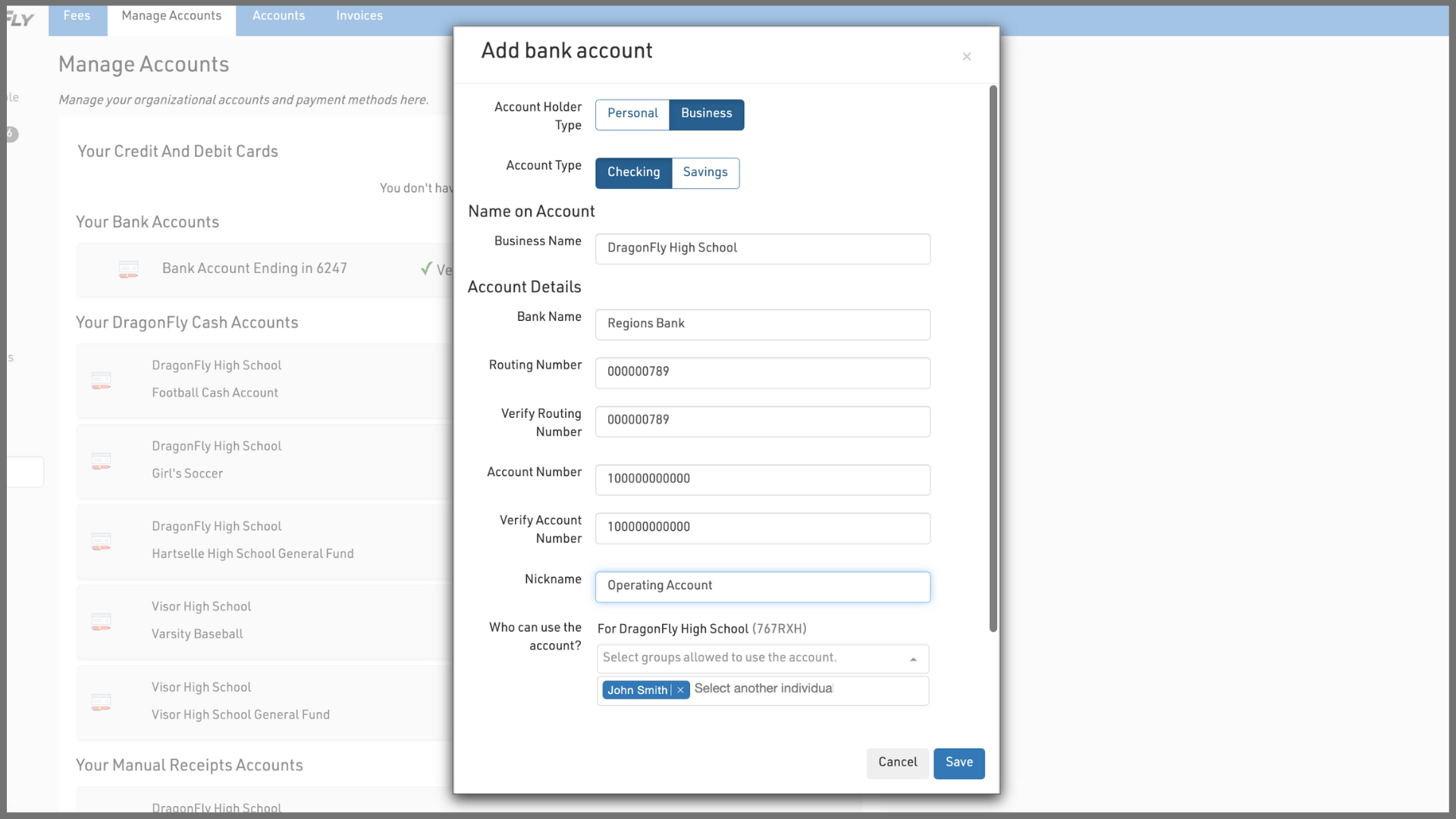 5. Complete each field with your bank account info. Be sure to select which people at your organization will have access to the account. You can give access to certain roles, like all Administrators, but we recommend giving access only to authorized individuals. Type an individual’s name to select their DragonFly account and grant access. Select 'Save' when completed.