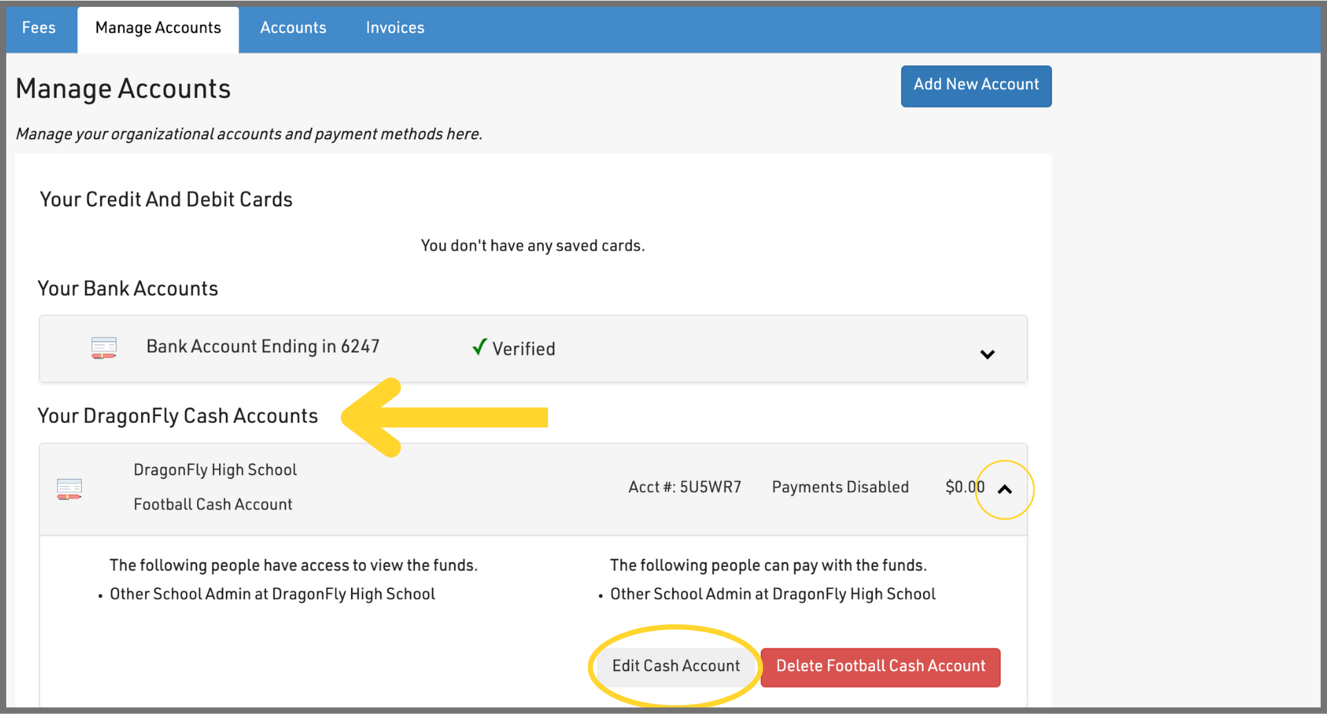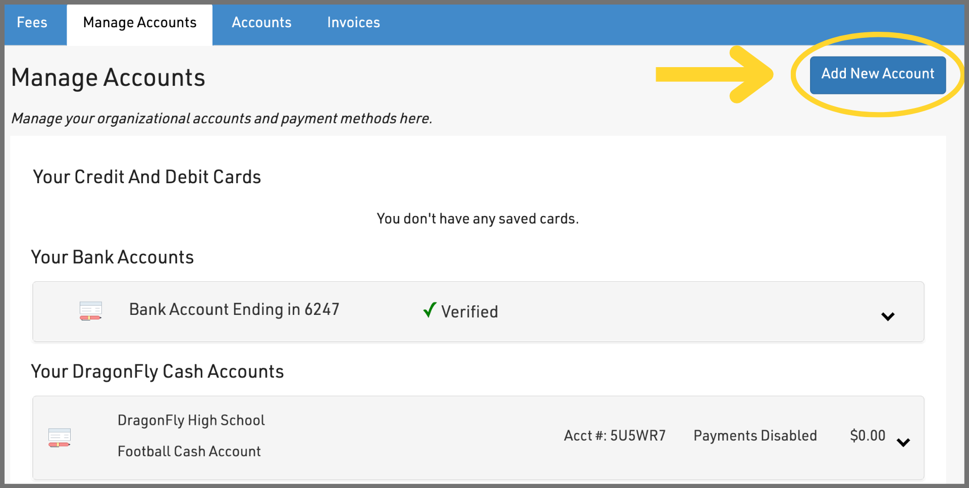 7. Now that you verified your funding source, direct your attention to the 'Your DragonFly Payments Accounts' section. A Payments Account is where you can load funds onto the platform and organize your funds by sport, team, school, or organization. Click here to watch a quick explainer video and learn more.