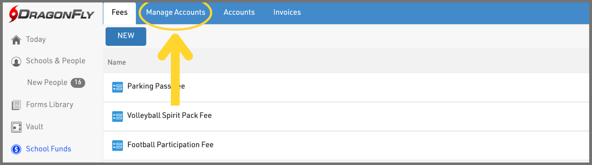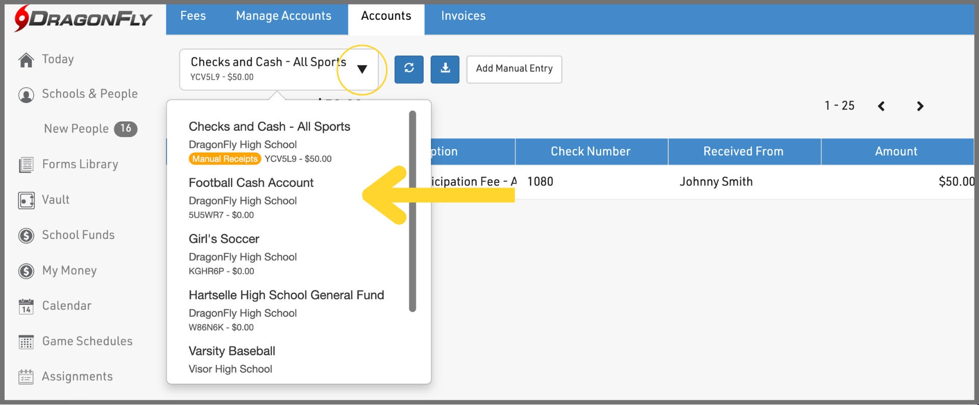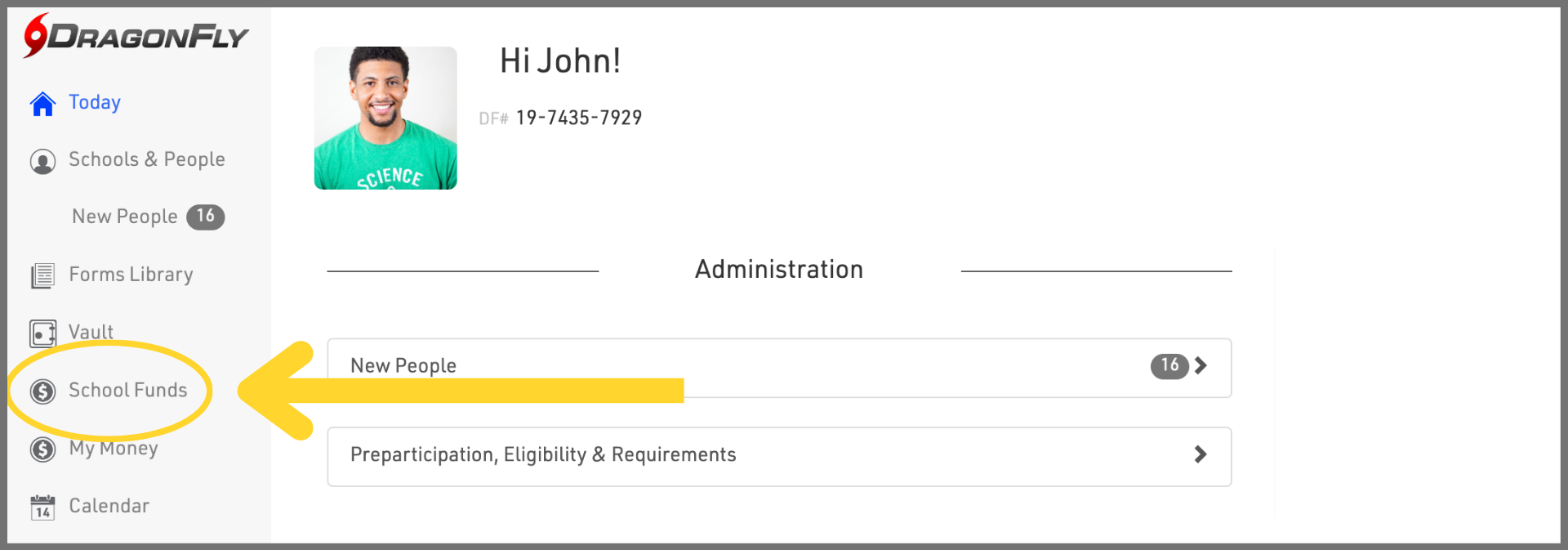 1. Log in to DragonFly on your computer's web browser and select 'School Funds' or 'Organization Funds' in the left-side menu.