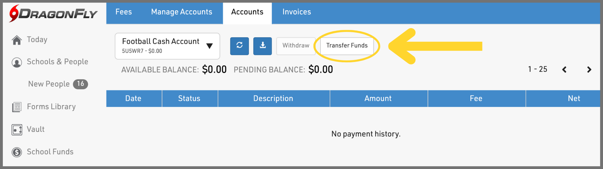 Your DragonFly Payments Account is where your organization's money is securely stored in the platform. If you've already set up and funded your Payments Account, click here for instructions on paying your officials and game workers.