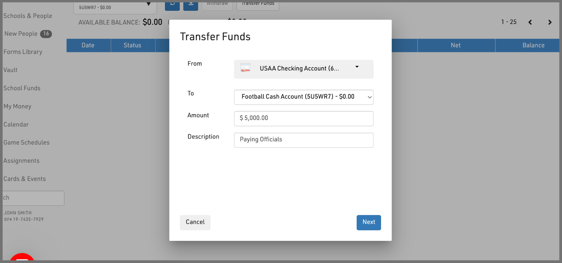 Schools and associations that want to pay officials and game workers can add money to their payments account by ACH transfer or check.