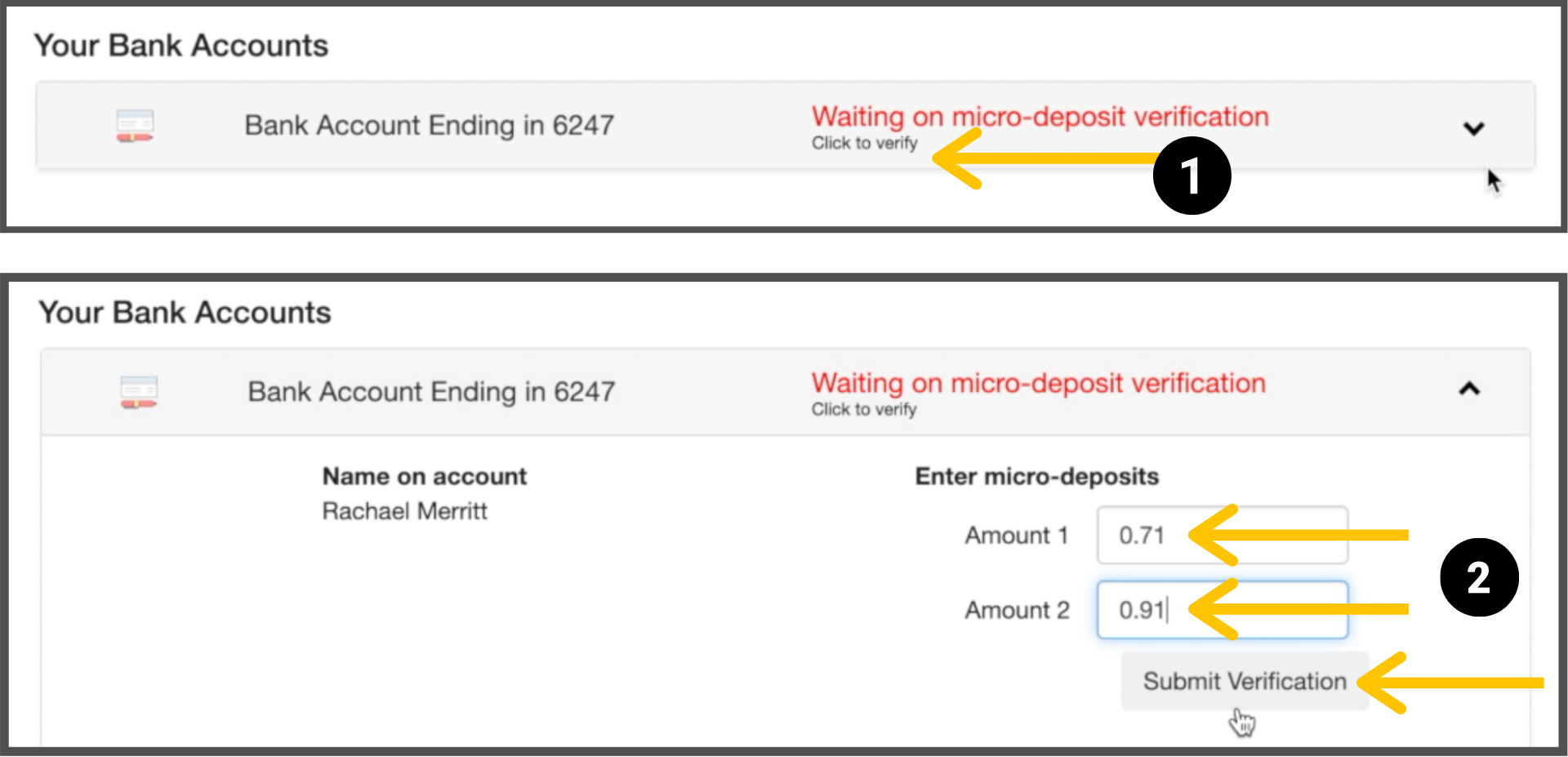 Note: Keep in mind that the micro-deposits will be reversed and withdrawn from your account in one sum after your account has been verified.