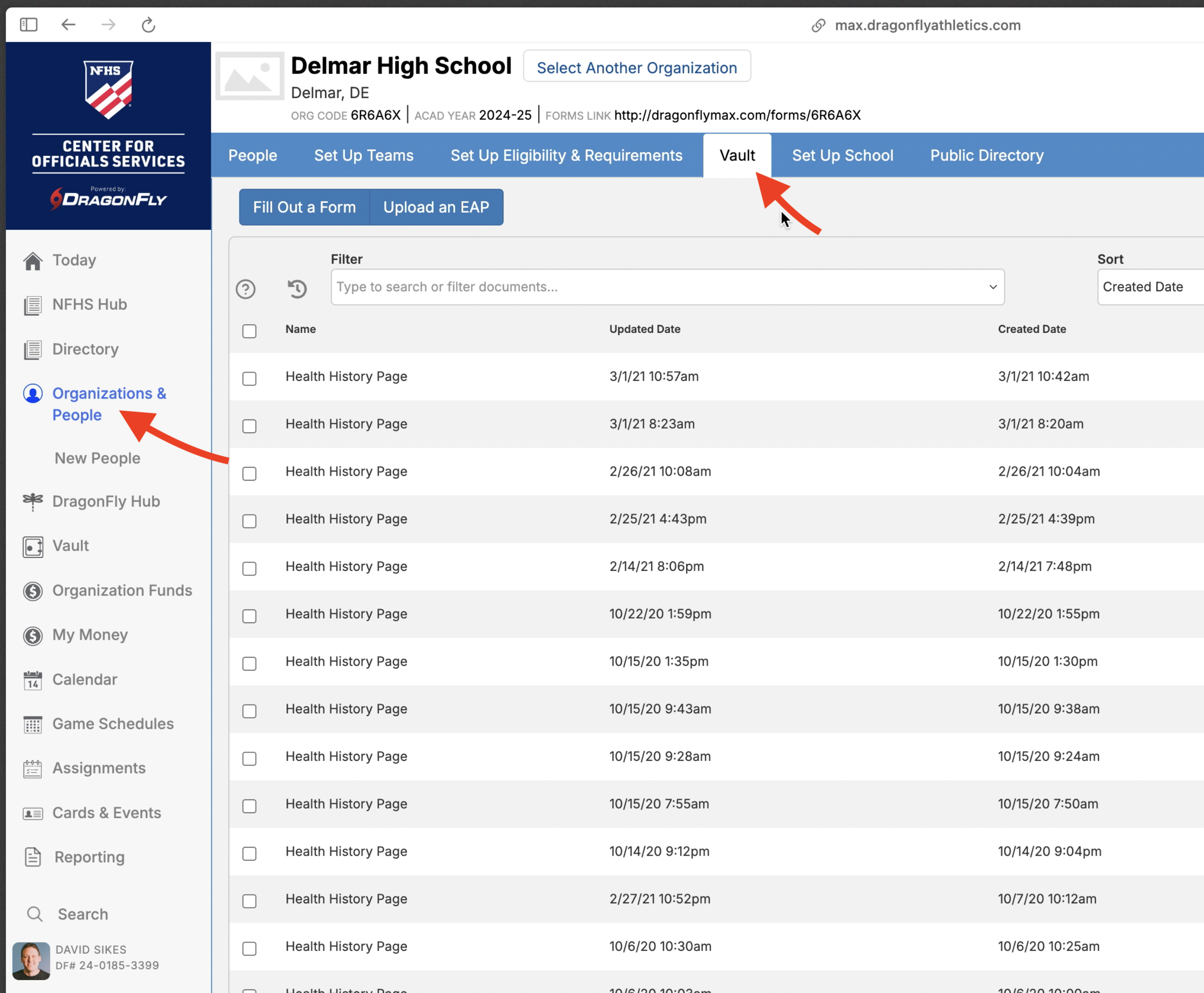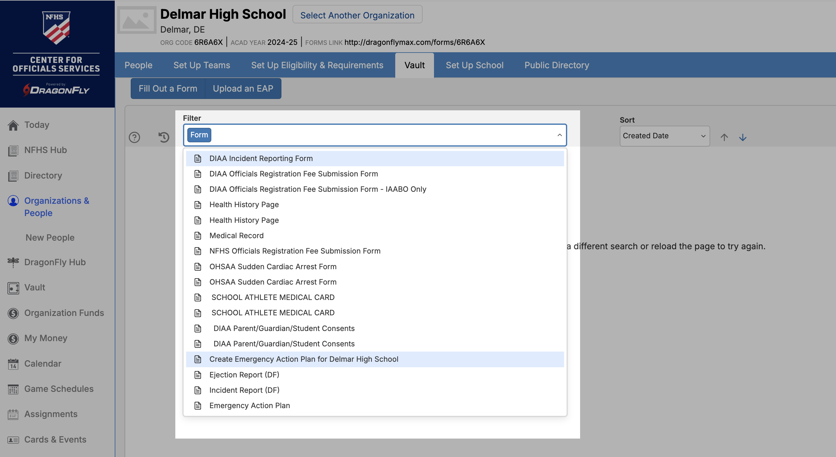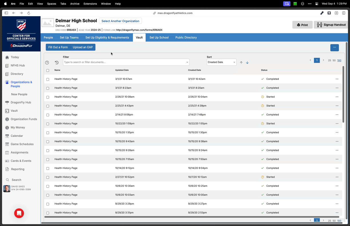 The vault in DragonFly MAX is a digital repository for all of your statewide forms, such as Incident Reports and Emergency Action Plans. It's a single hub to see completed documents, access new ones, and submit to your association or organization.