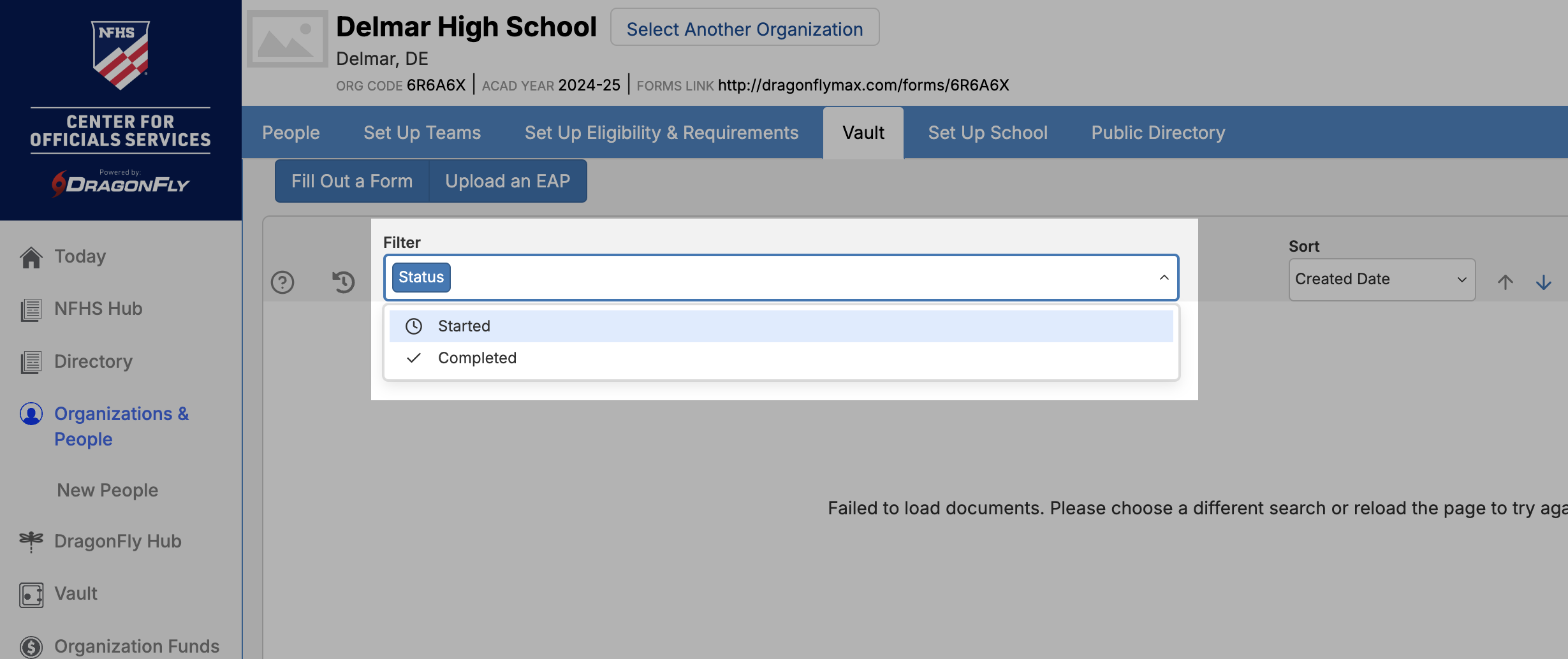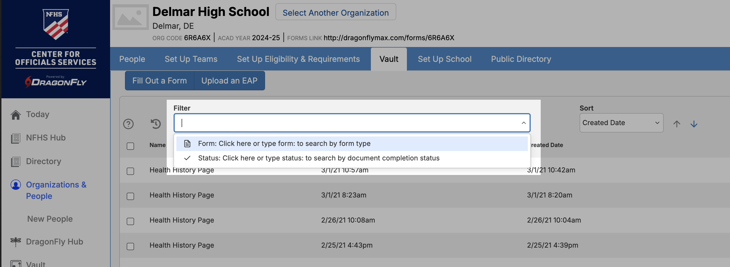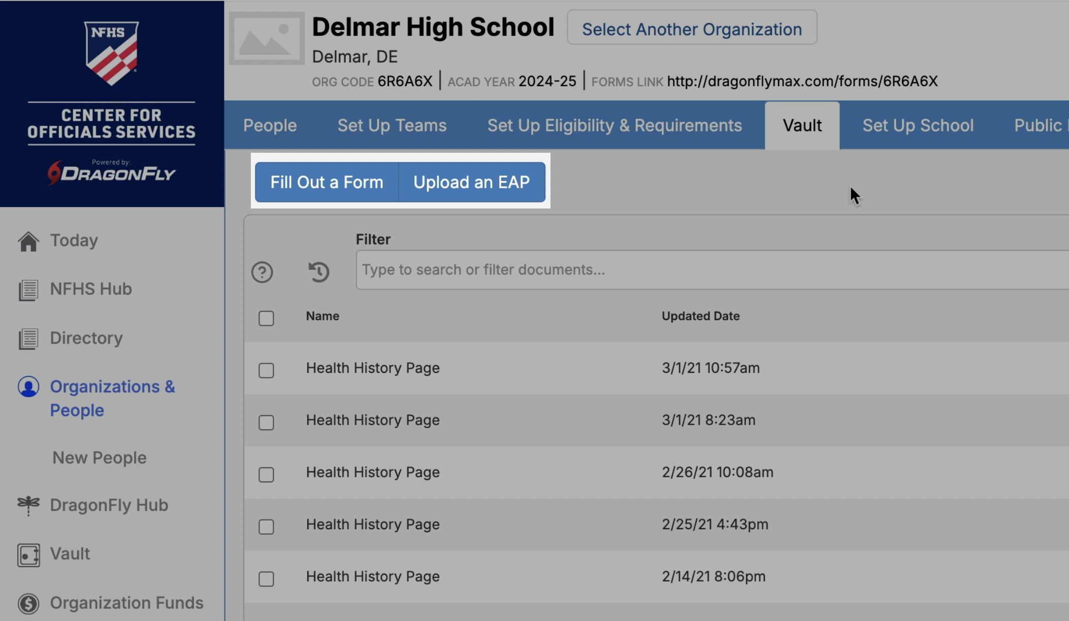 The vault in DragonFly MAX is a digital repository for all of your statewide forms, such as Incident Reports and Emergency Action Plans. It's a single hub to see completed documents, access new ones, and submit to your association or organization.