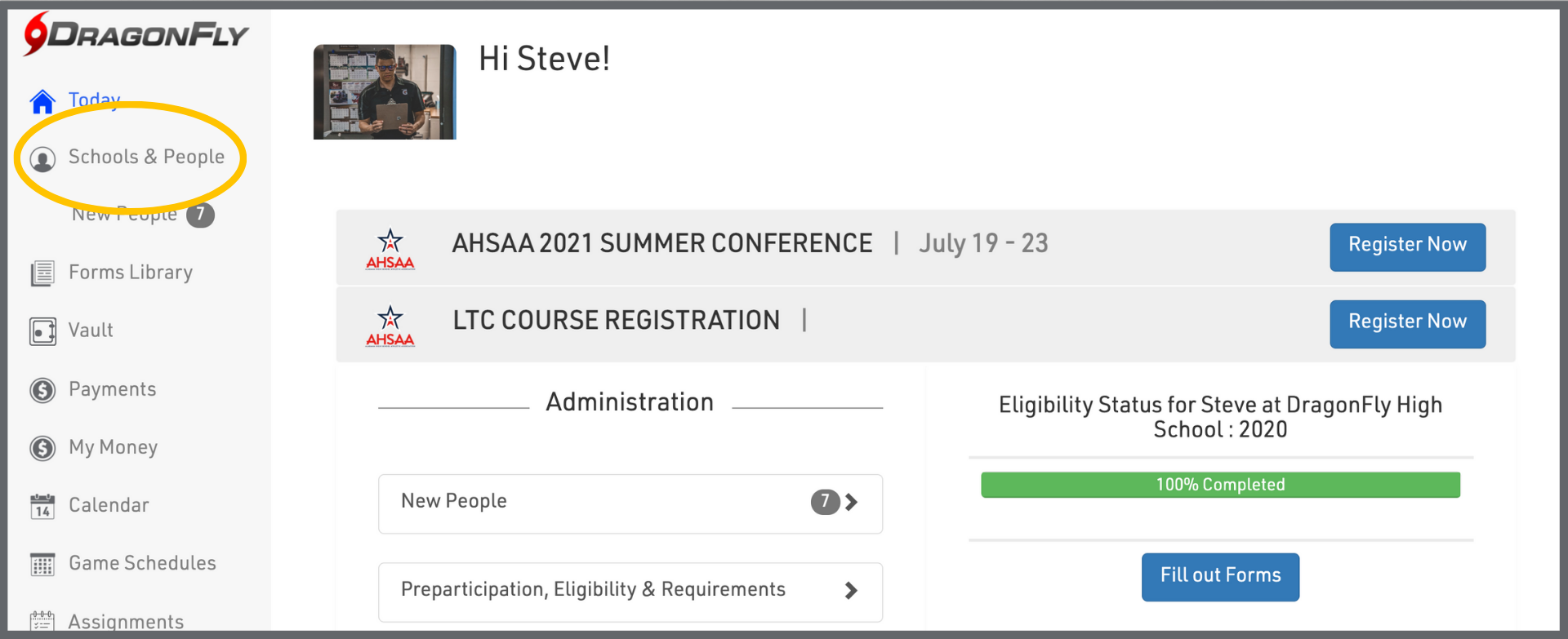 Log in to DragonFly on your computer's web browser and select 'Schools & People' from the left-side menu.