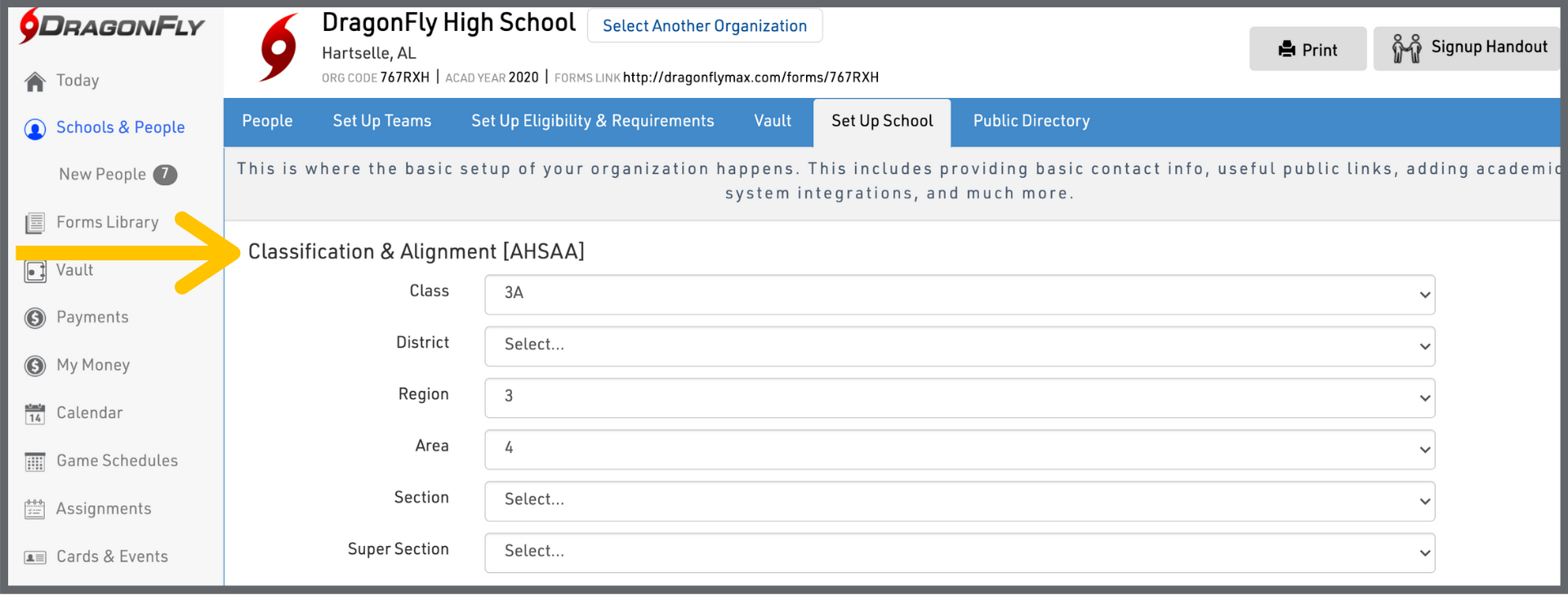 A control panel will appear on your screen where you will see a 'Classification and Alignment' heading. Use the drop-down menus to choose your classification, region, area, section and super section if they are different from your school. If this section is disabled, that means your state association does not allow these changes to be made in DragonFly.