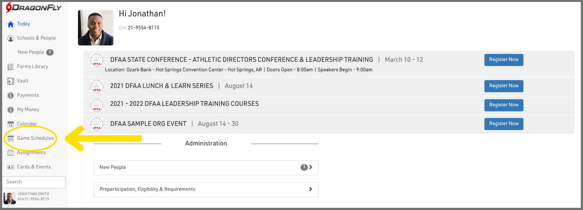 1. Log in to DragonFly on your computer's web browser and select ‘Game Schedules’ in the left-side menu.