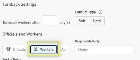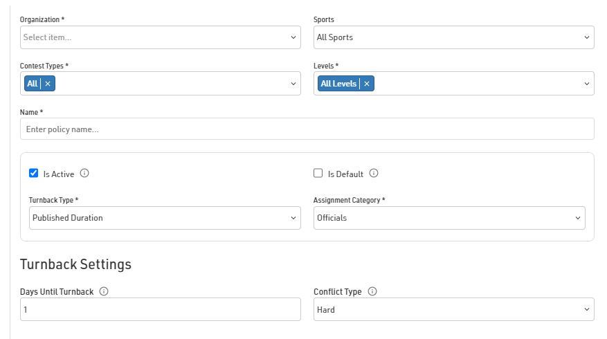 "Days Until Turnback" refers to the number of calendar days from the date the assignment was published for the turnback to occur (e.g. if you set 5 days, then 5 days after you publish an assignment, if the official/worker has not accepted the assignment, they will be turned back.)