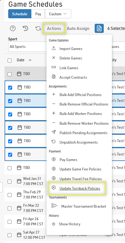 Then click on the Actions button at the top and select 'Update Turnback Policies