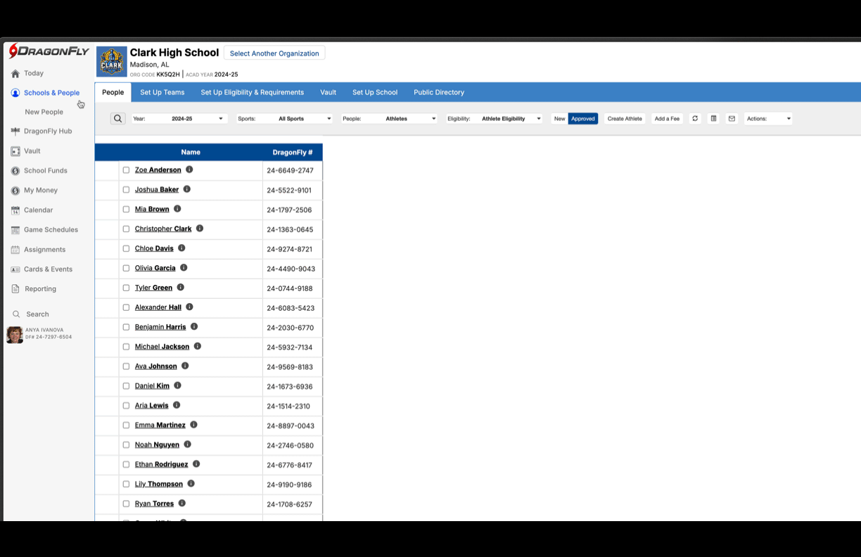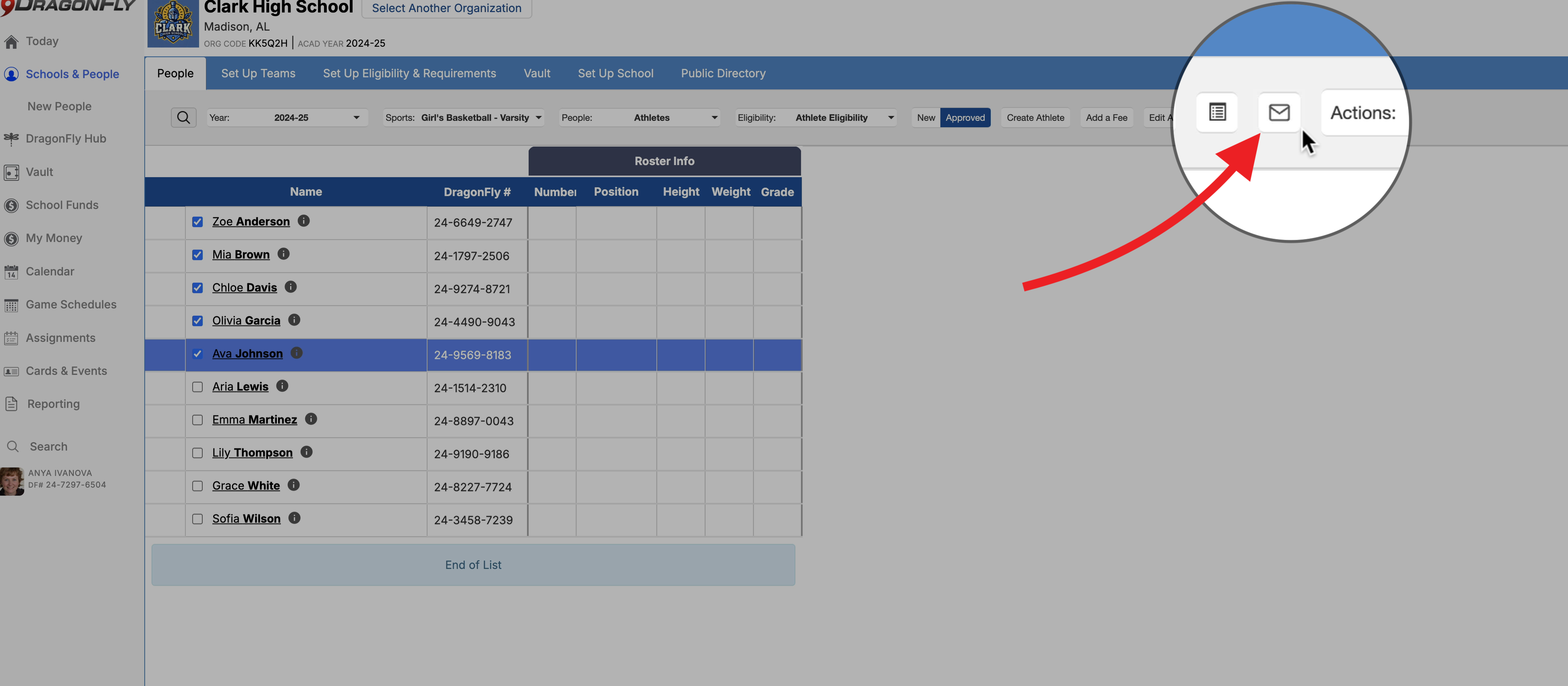 It's easy to communicate using DragonFly! Follow the steps below to quickly send a message to a team, individuals, or groups in your organization directly from Schools & People / Organizations & People or the Game Schedule.