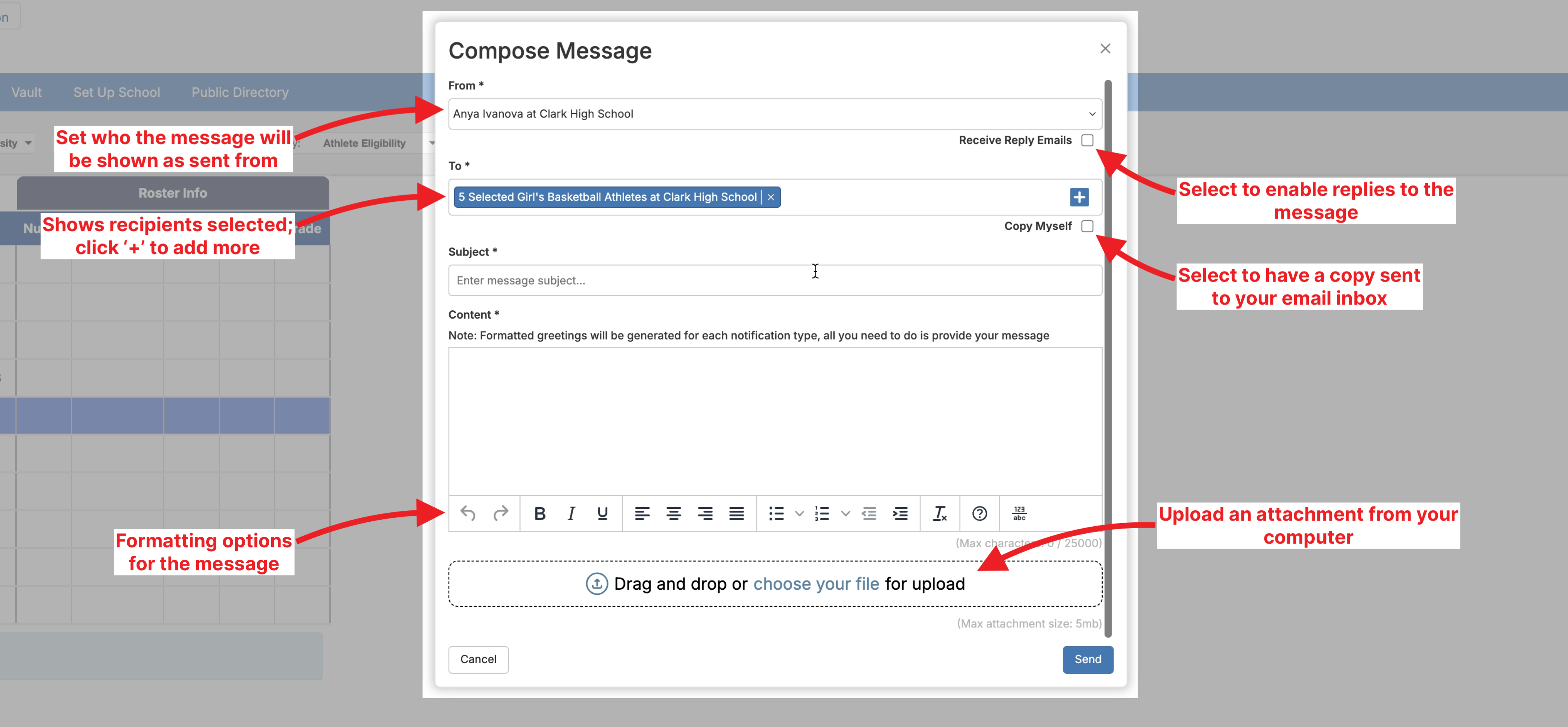 You can format your message with familiar tools (bold, italicize, etc.) and upload files to be sent as attachments.
