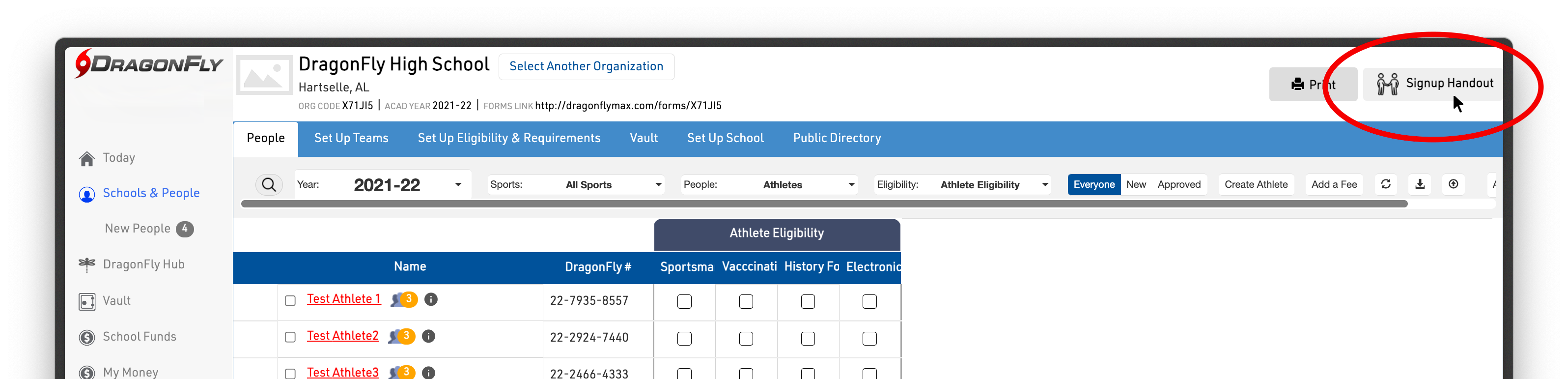 In Schools & People, click the "Signup Handout" button on the top-right corner