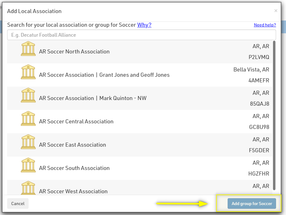 6. Select your association(s) that you need and click "Add Group for Soccer"
