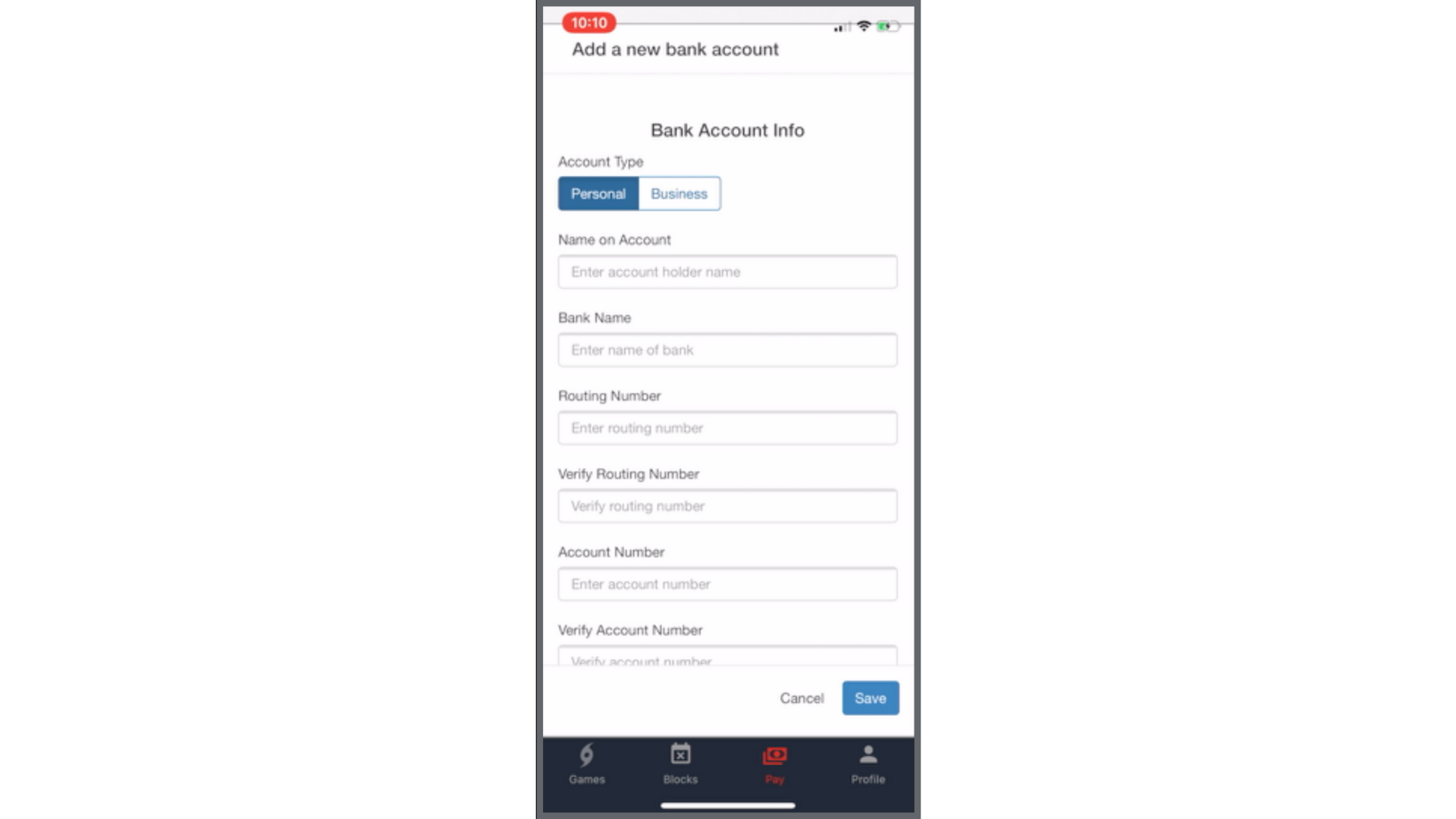 2. Tap on the 'Withdraw' button and then the 'Add Bank Account' button. Our system supports both checking and savings accounts.