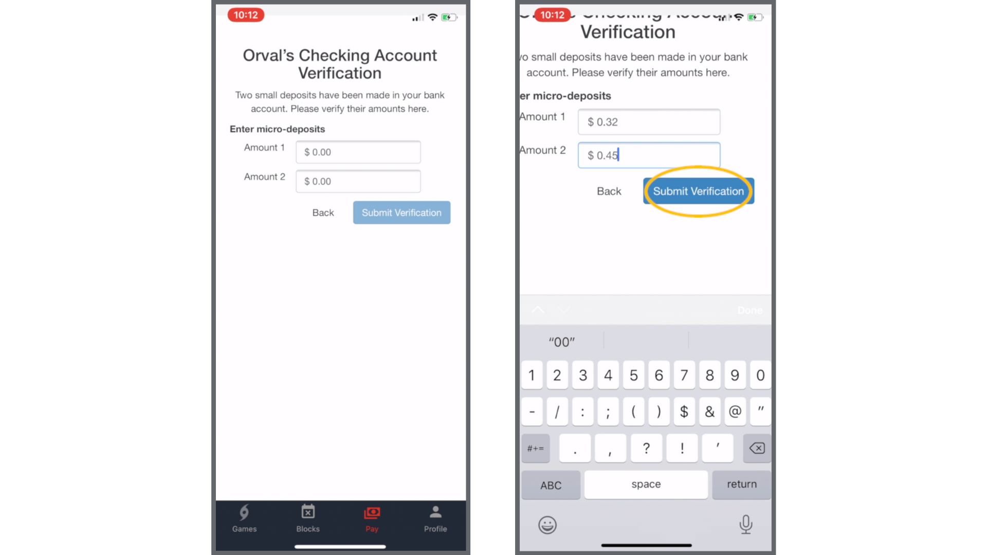 6. Enter each micro-deposit amount and then the 'Submit Verification' button.