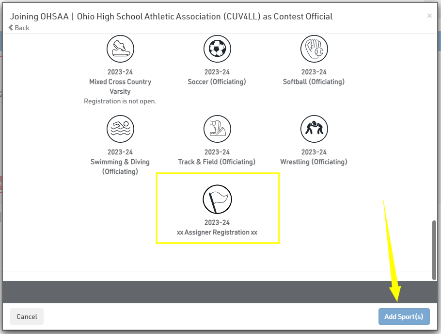 10. Select “Assigner Registration” along with any sports that you will be registering to assign and click "Add Sports".