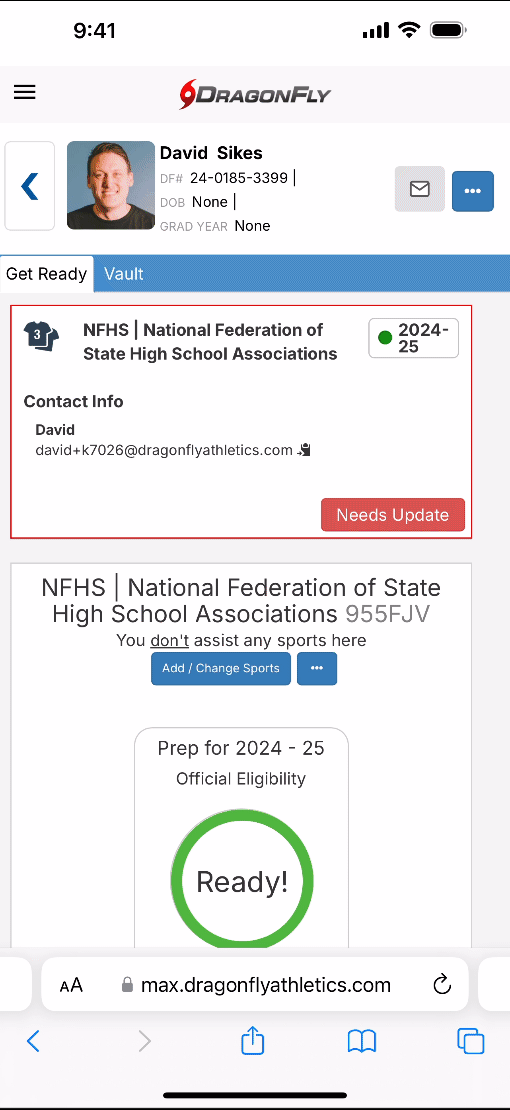 Log into your account at max.dragonflyathletics.com. Click on your name in the left-hand navigation bar, and select 'My Info'.