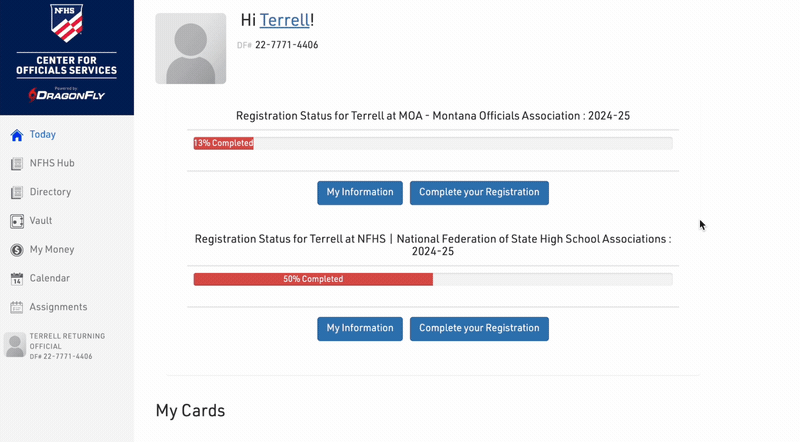 On the 'Today' page, you'll see your registration status for every organization you are registered for. Begin with your respective state association, and get started by selecting 'Complete your registration'.
