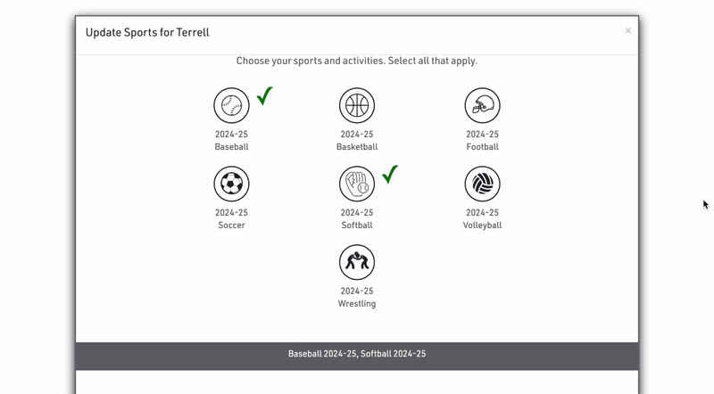To remove sports you have registered for in the past, deselect by clicking on the sport. To add additional sports, you can click those as well. Click 'Save Sports' to finalize your selections. As a reminder, once you click 'Save Sports' you will not be able to remove any sports without contacting your organization administrators.