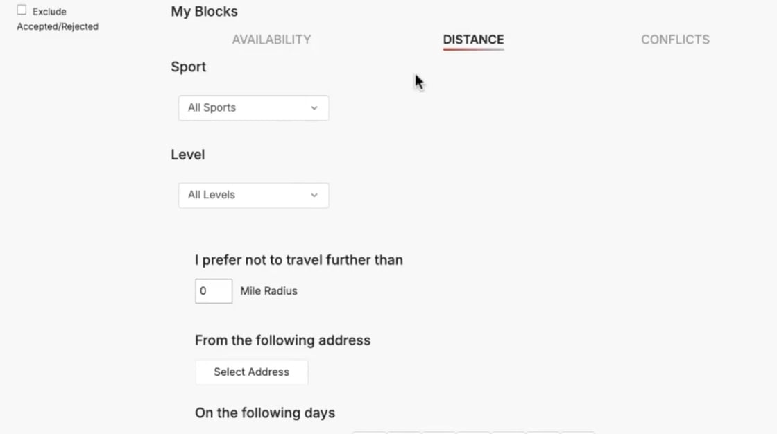 Enter any preferences you have regarding sports and levels, and type in the maximum mile radius from your address you'd like to create the block with.