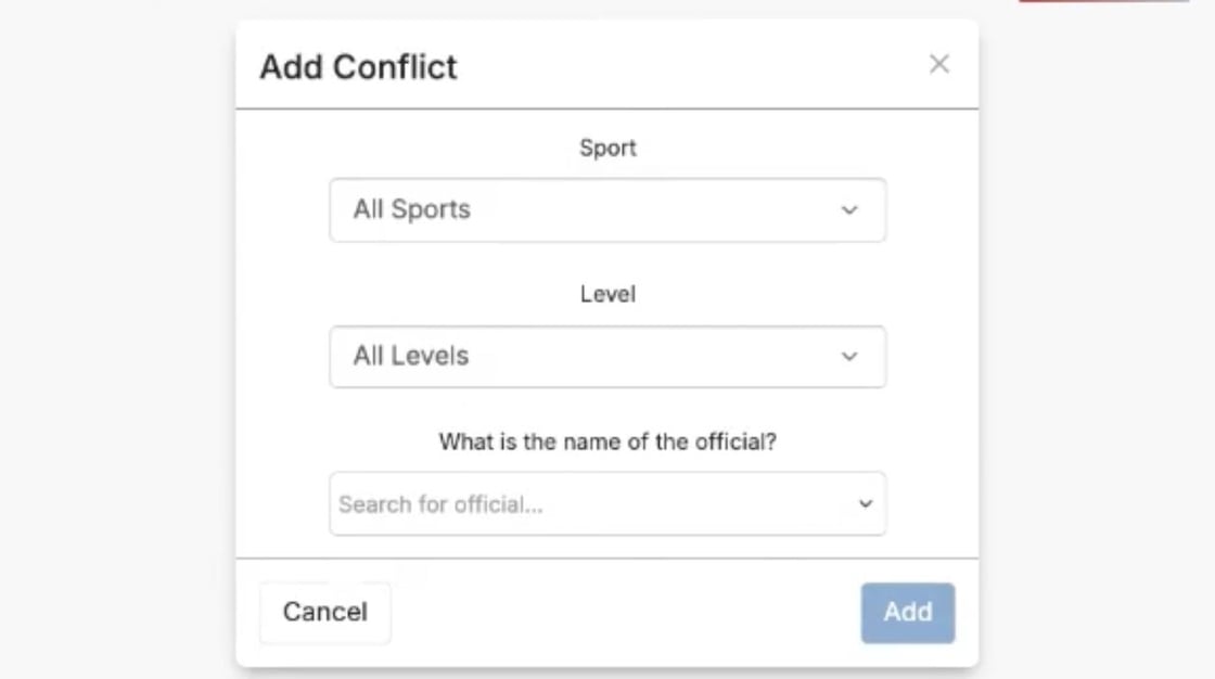 To set up an official block, simply define the sport and level and enter the name of the contest official. Click Add to finish.