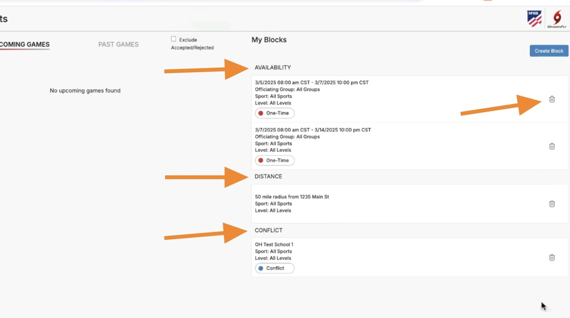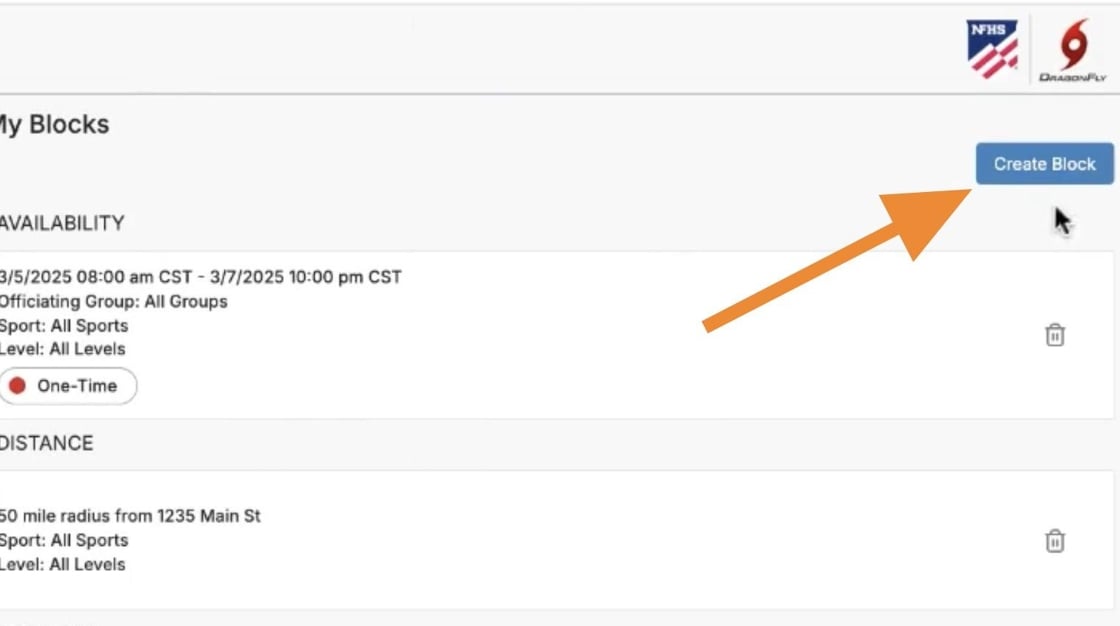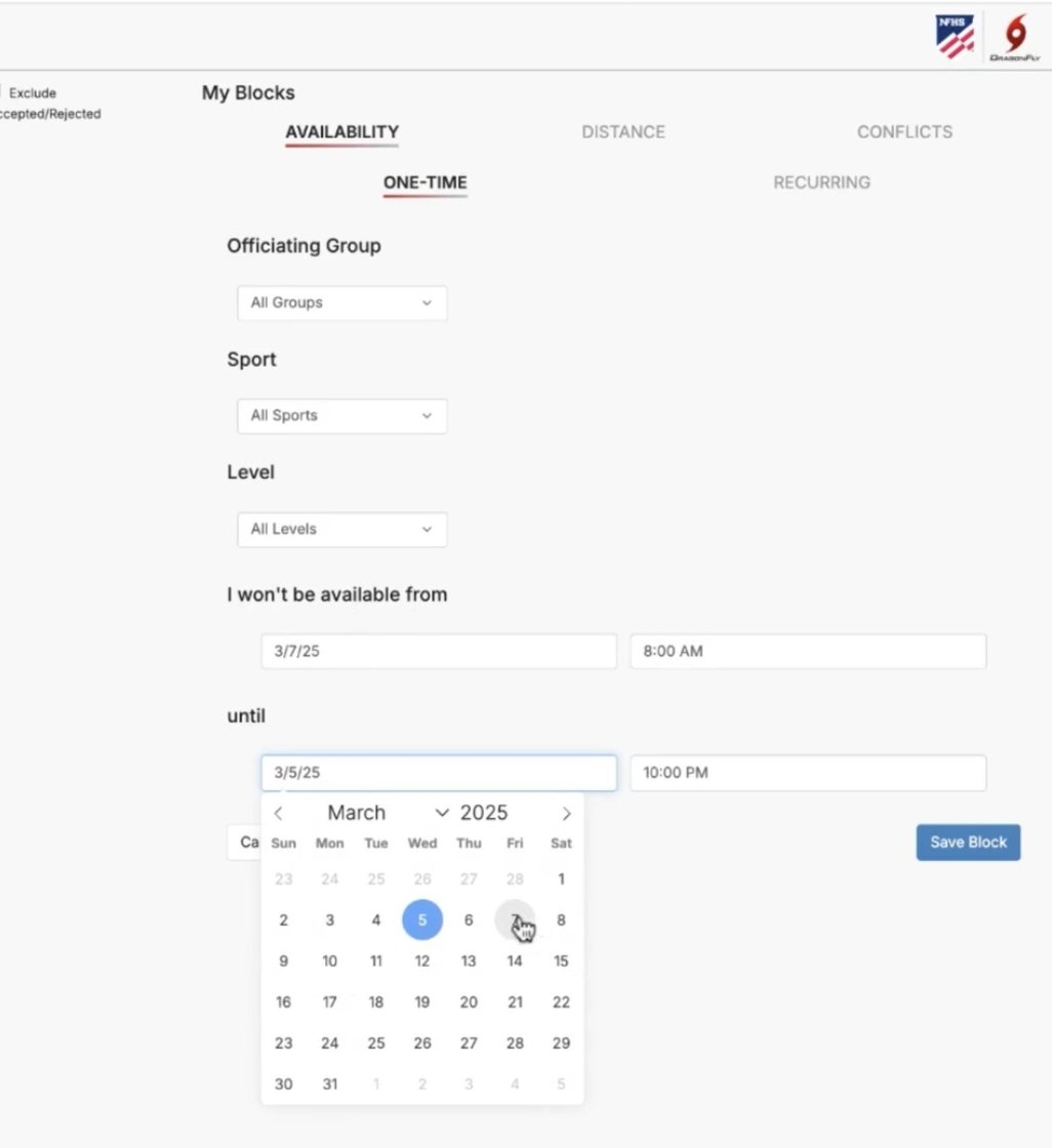 Blocks are an important tool for communicating to your assigners where you are or are not available to work as a contest official. Entering in blocks ensures an efficient assignment process for all and reduces headaches for both you and your assigners.