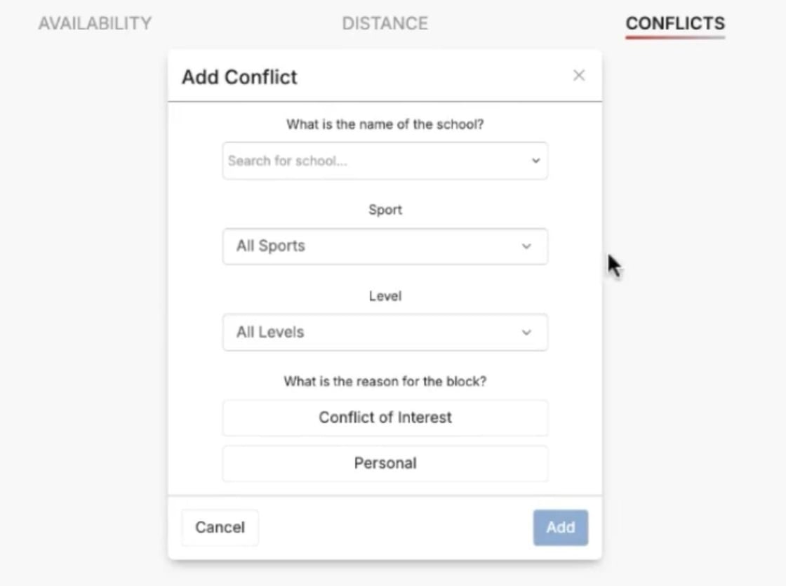 A personal block is for situations where you simply have a personal reason for needing to avoid officiating a school's game (such as a personal issue with the coach of a team). Please note that your state may place a limit on the number of personal blocks allowed.