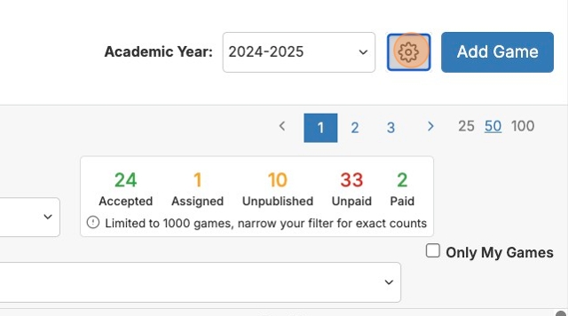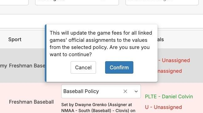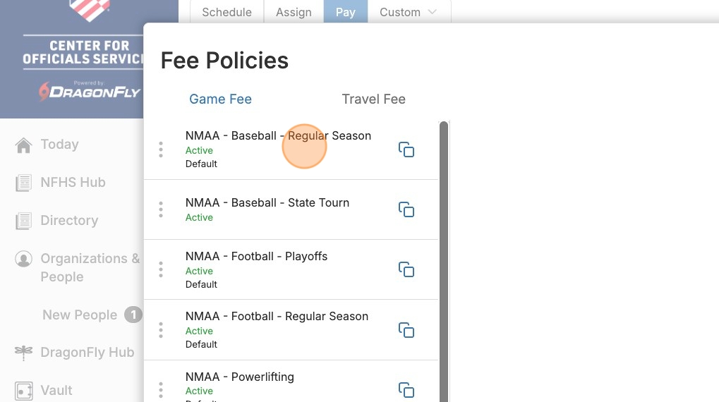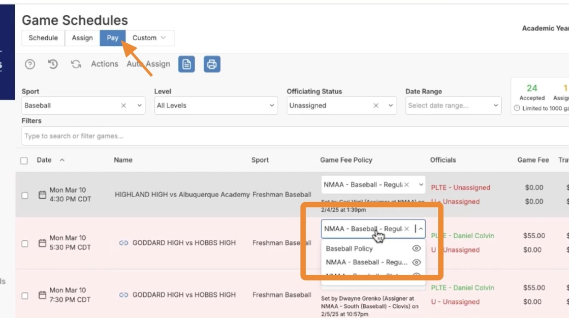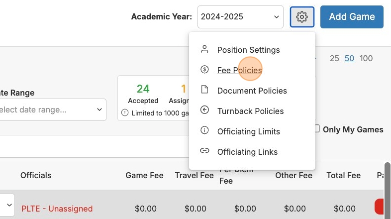 In the Game Schedule in the Pay view, click the dropdown in the 'Game Fee Policy' column to see available policies.