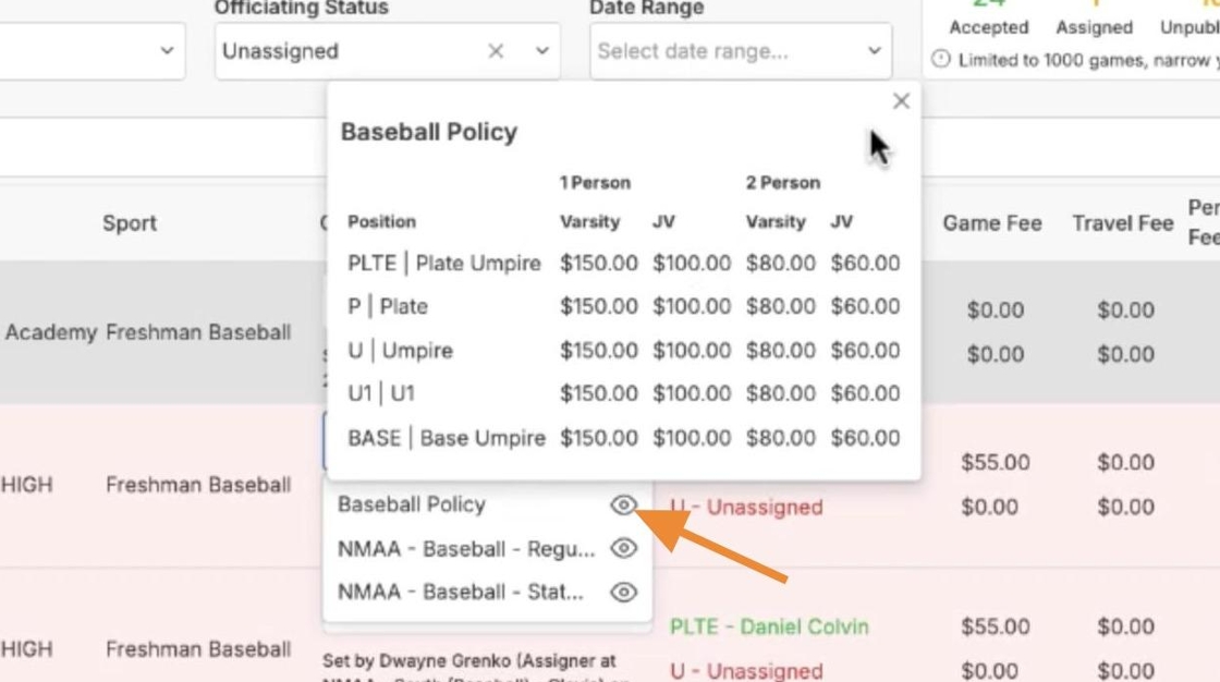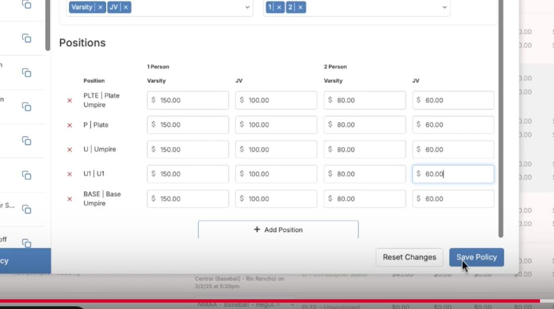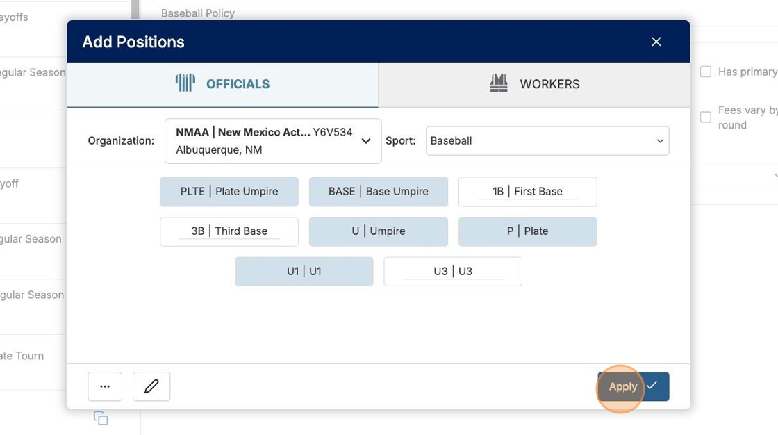In the example below, we've applied it to Baseball officials with the positions of Plate Umpire, Base Umpire, Umpire, Plate, and U1.