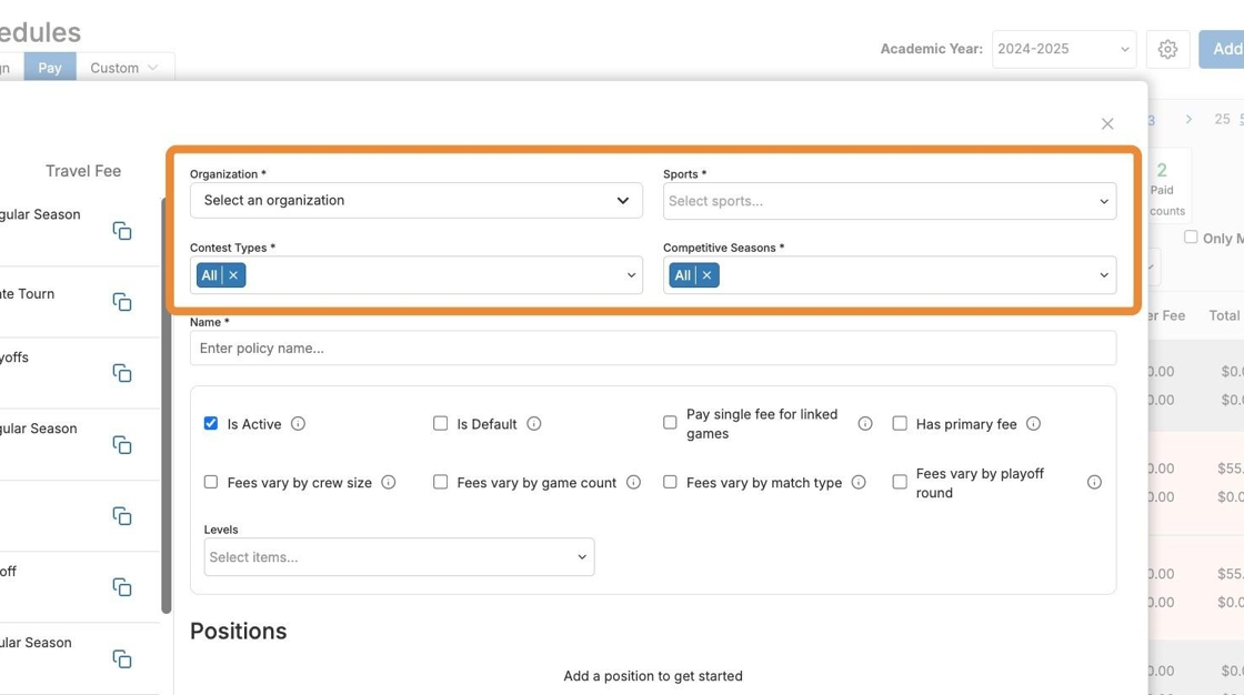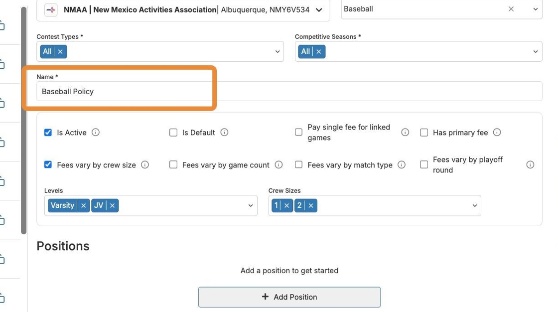 Select the organization this policy applies to, the sports it is for, and you can designate what contest types or competitive seasons this policy applies to.
