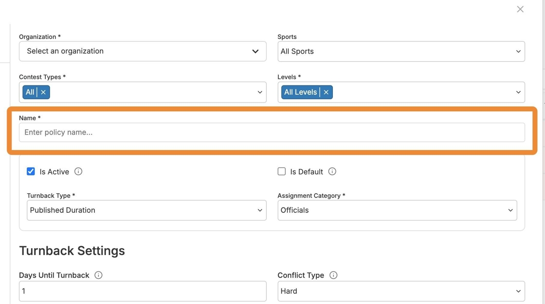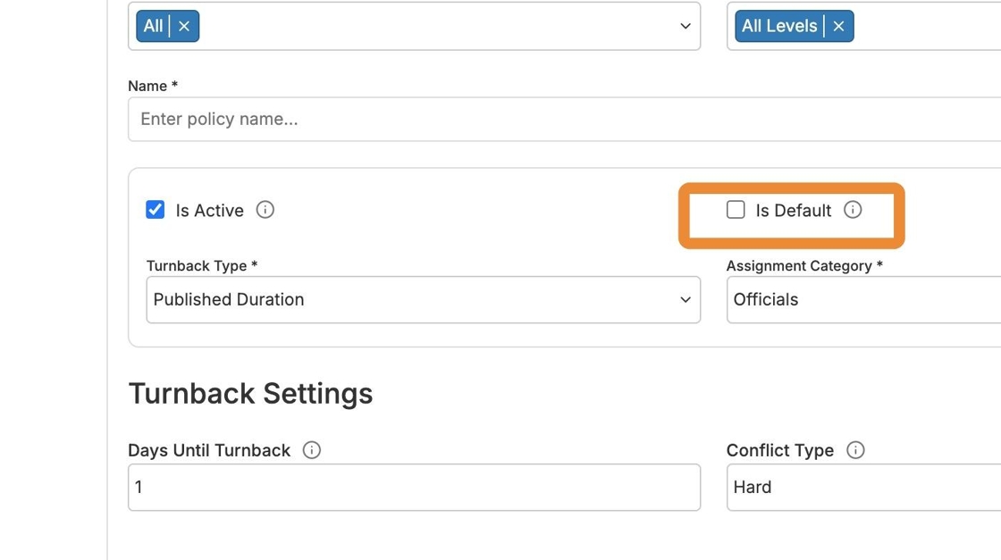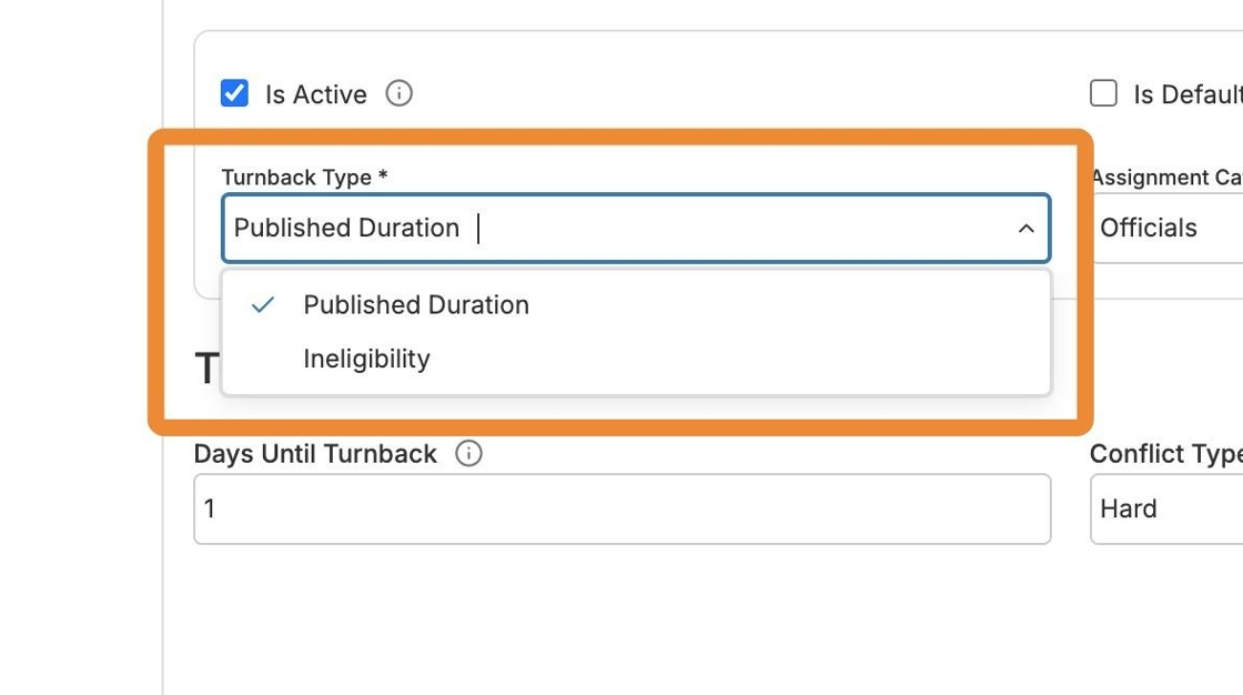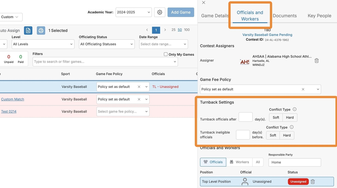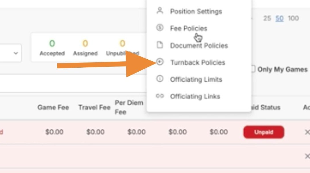 A turnback policy can be set up for ineligible officials to be removed from a game within a certain number of days leading up to the contest if they do not become eligible or can be set up to require your officials to accept or reject an assignment within a certain number of days after they have been assigned.