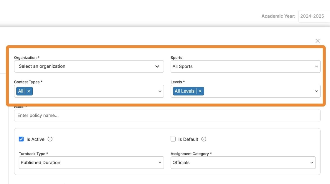 Set the organization for the policy, what sports are included, and you can choose to apply it to specific contest types (regular season, playoffs, etc.) or competing levels (JV, varsity, etc.)