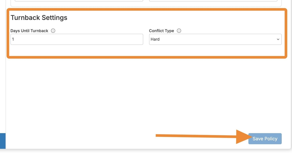 Finally, set the number of days for the turnback policy and designate the conflict as a Soft or Hard conflict block (as explained earlier).