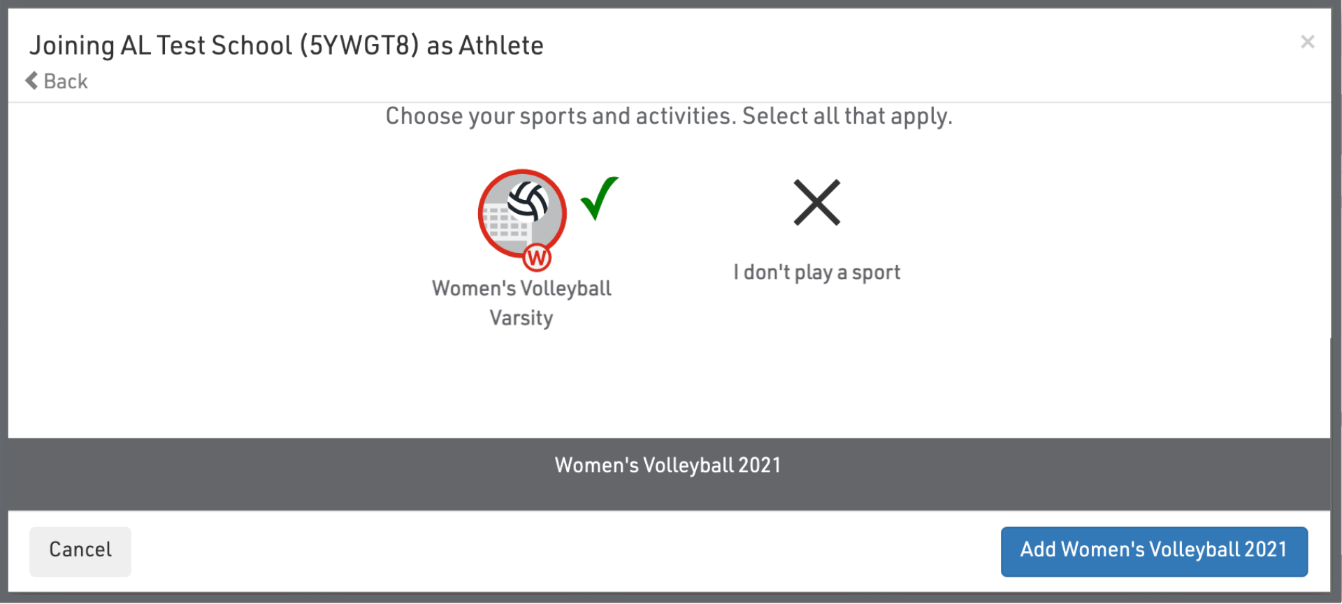 5. Select all of the sports and activities that you will be participating in, then click the 'Add' button in the bottom corner.