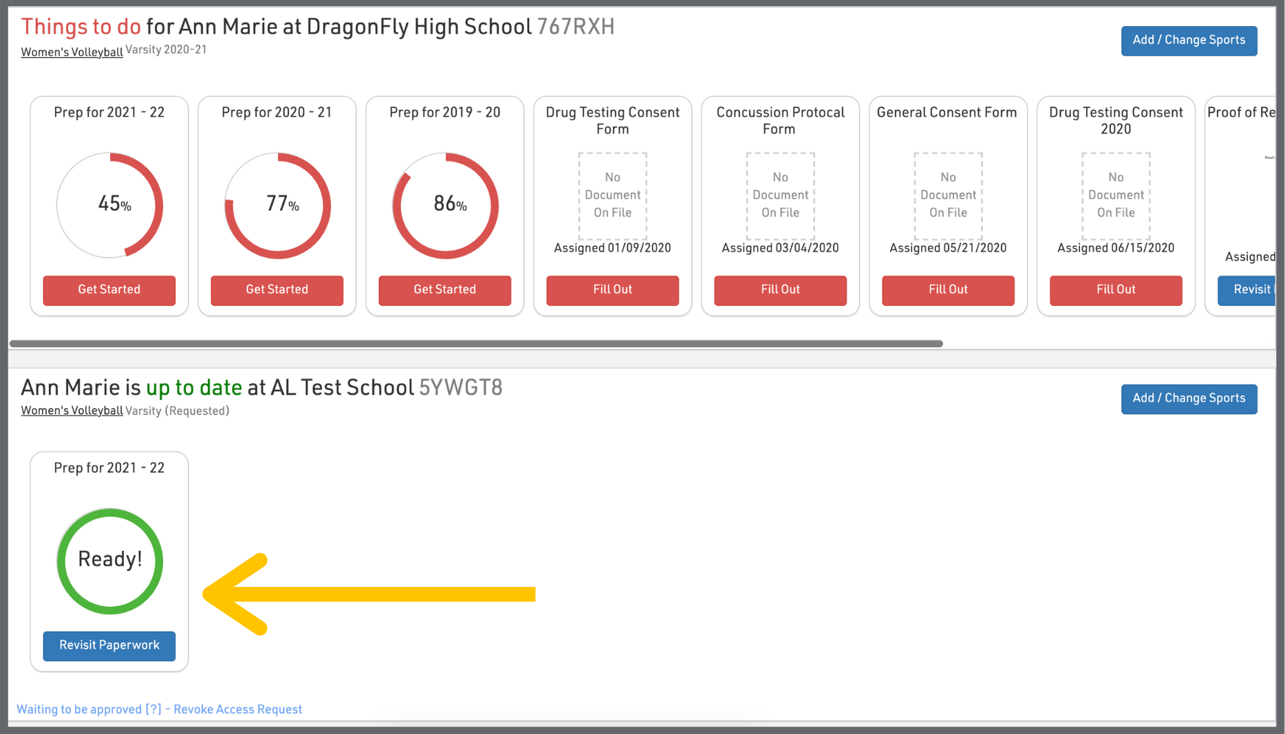 7. Refresh/reload your profile page, and you should now see a block in your profile with the new school. Click the 'Get Started' button to complete registration/paperwork for the upcoming school year. You do not need to wait for approval to begin this paperwork.