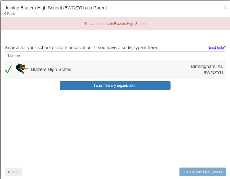 Note: If you are trying to add a new role by joining a school you already are connected to in order to change your role, you will get the following error message:
