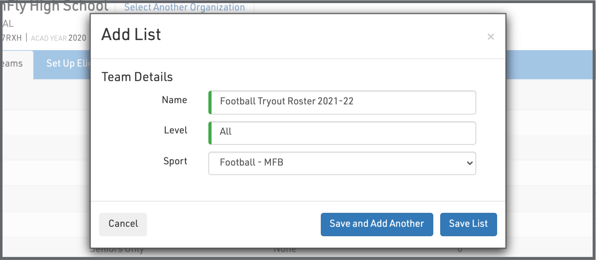 5. To add a new team, select the ‘Add Teams’ button, then complete all team information. If you’re adding multiple teams, select the ‘Save and Add Another’ button. To save a single team, select the ‘Save’ button.