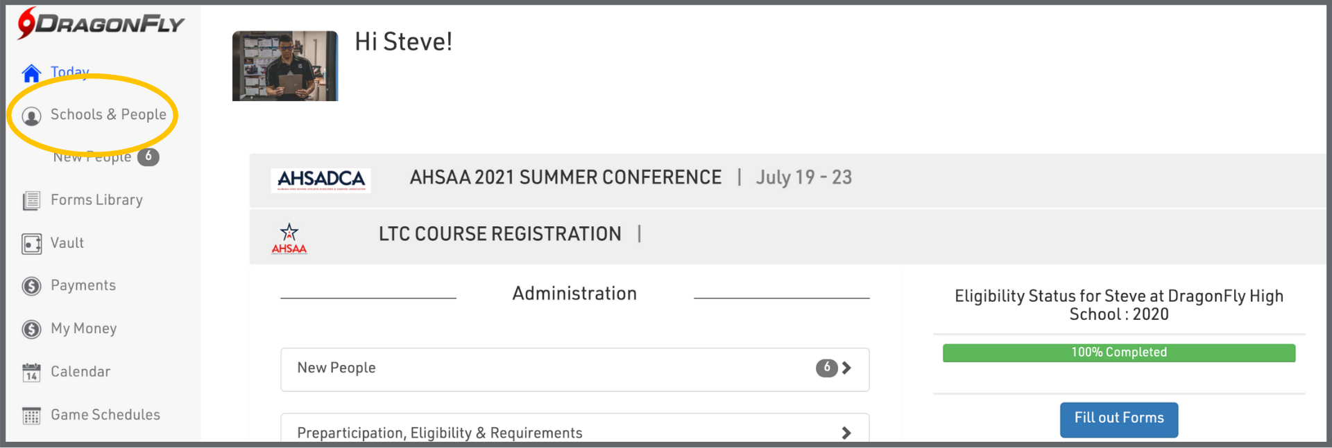 1. Log in to DragonFly on your computer's web browser and select 'Schools & People' from the left-side menu.